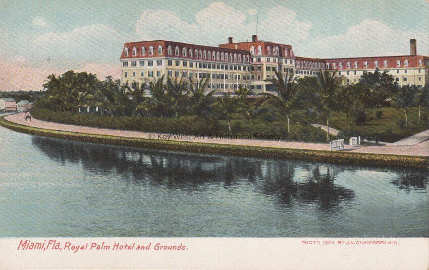 Postcard depicts a large hotel with water and a road in the foreground. The caption reads, ‘Miami, Florida, Royal Palm Hotel and Grounds. Photo 1904 by J.N. Chamberlain’.Collection