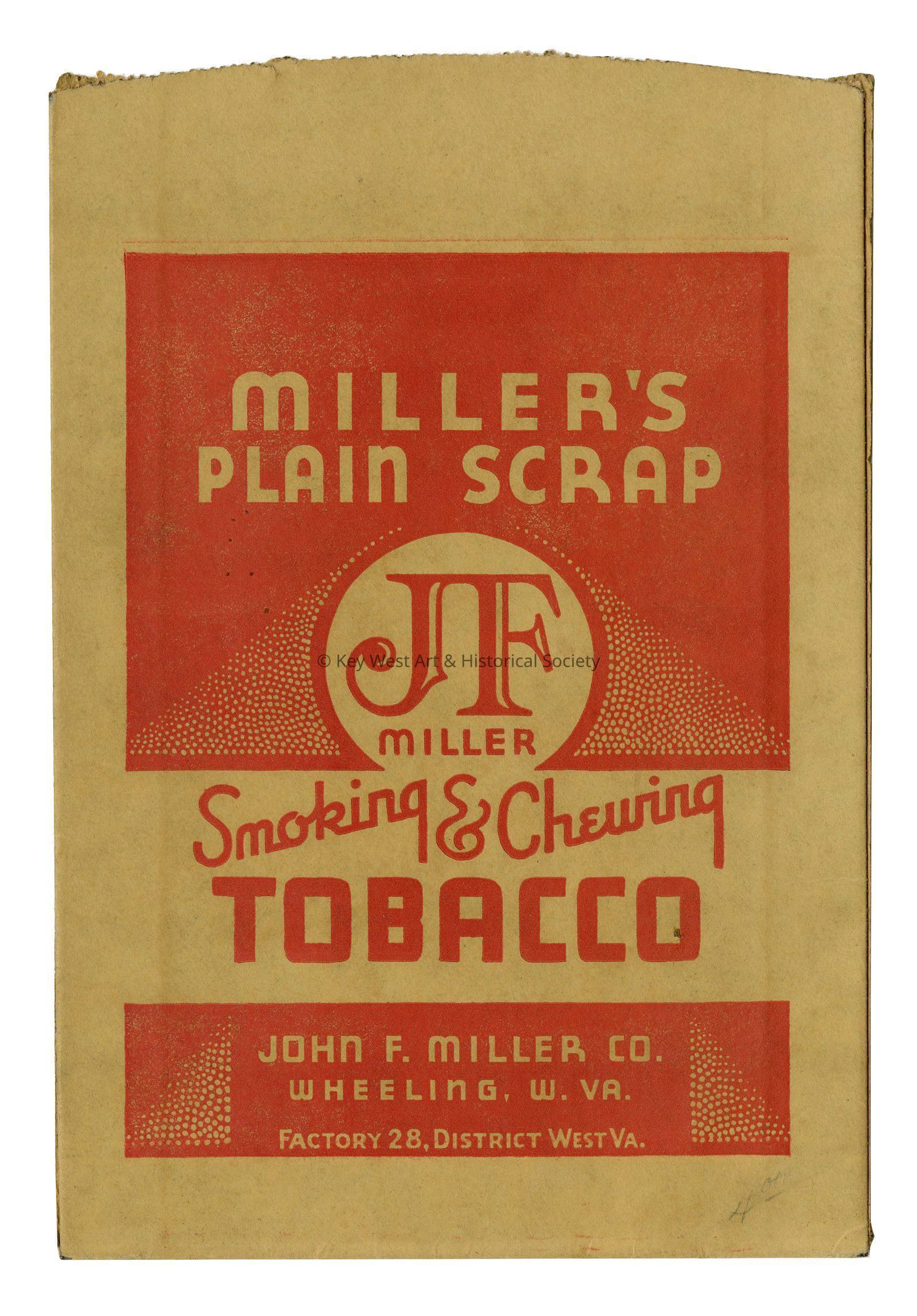 Unused brown paper bag intended to be used for Miller's Plain Smoking and Chewing tobacco scraps. Bag provided by the John F. Miller Company. Scraps were sold to customers for use as chewing tobacco.Collection