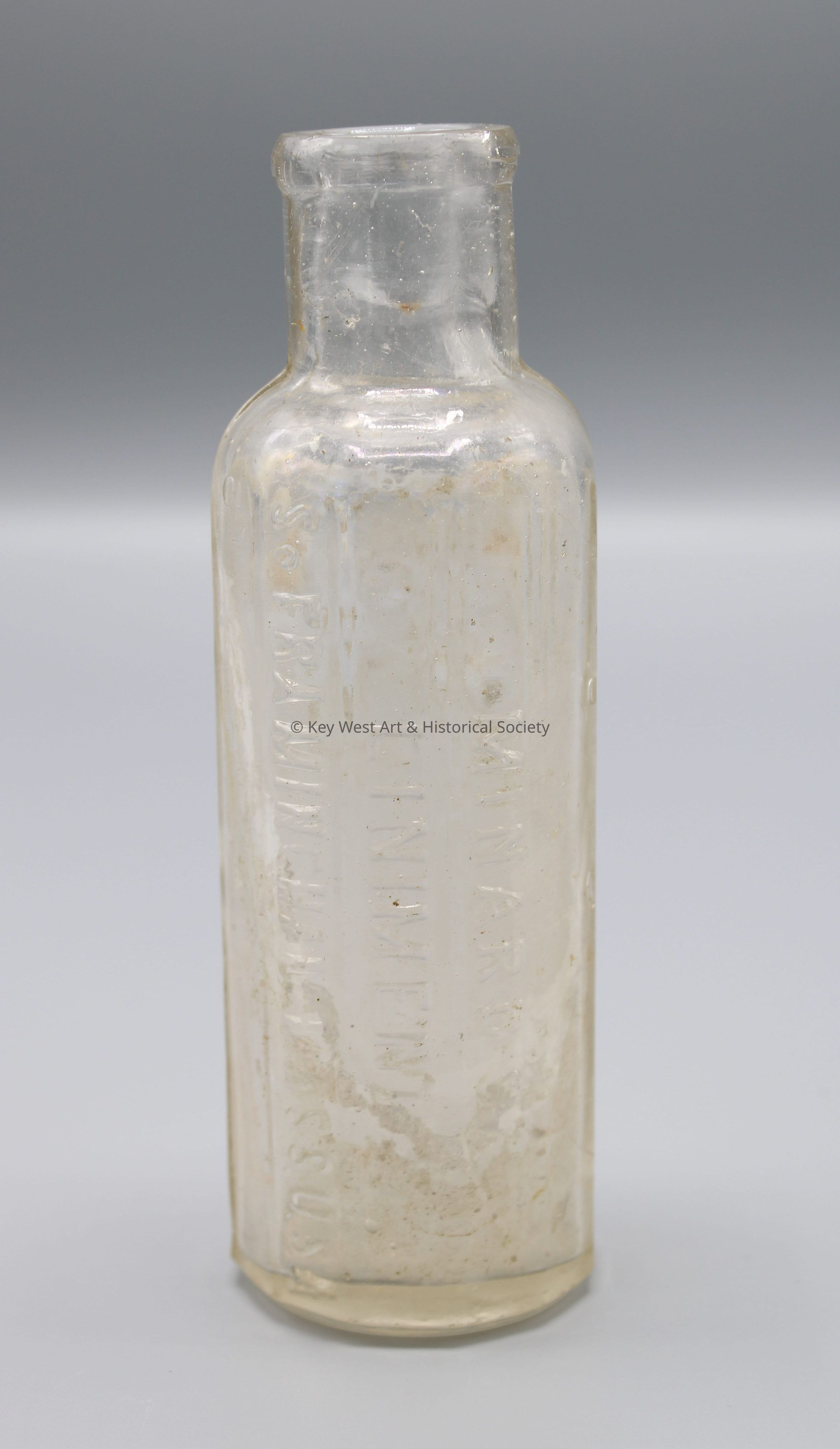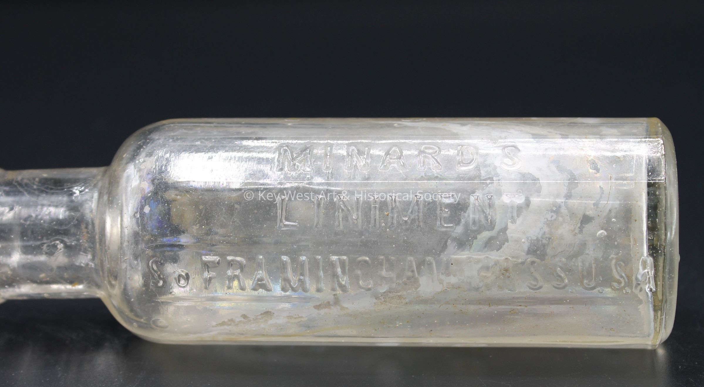 Clear glass bottle with embossing that reads 'Minard's Liniment So. Framingham, Mass. U.S.A.' The bottle was originally excavated by the donor's mother, Grace Curlee, during the restoration of Fort Zachary Taylor in the 1960s.