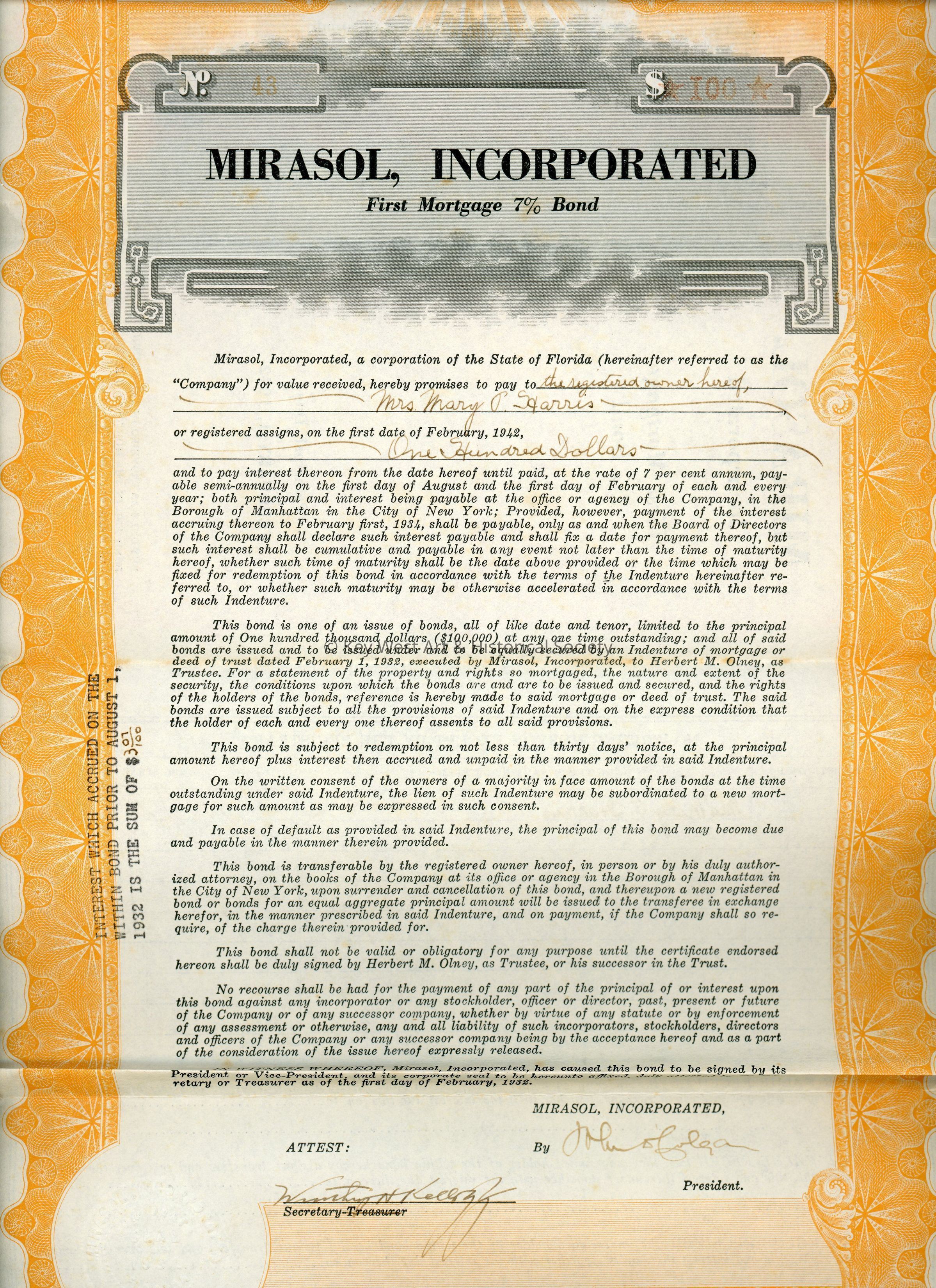 Paper $100 'First Mortgage 7% Bond' from Mirasol, Incorporated owned by Mrs. Mary P. Harris. The bond stuck to a board for display in Wachovia Bank. The bank was formerly located at 420 Front Street.Collection