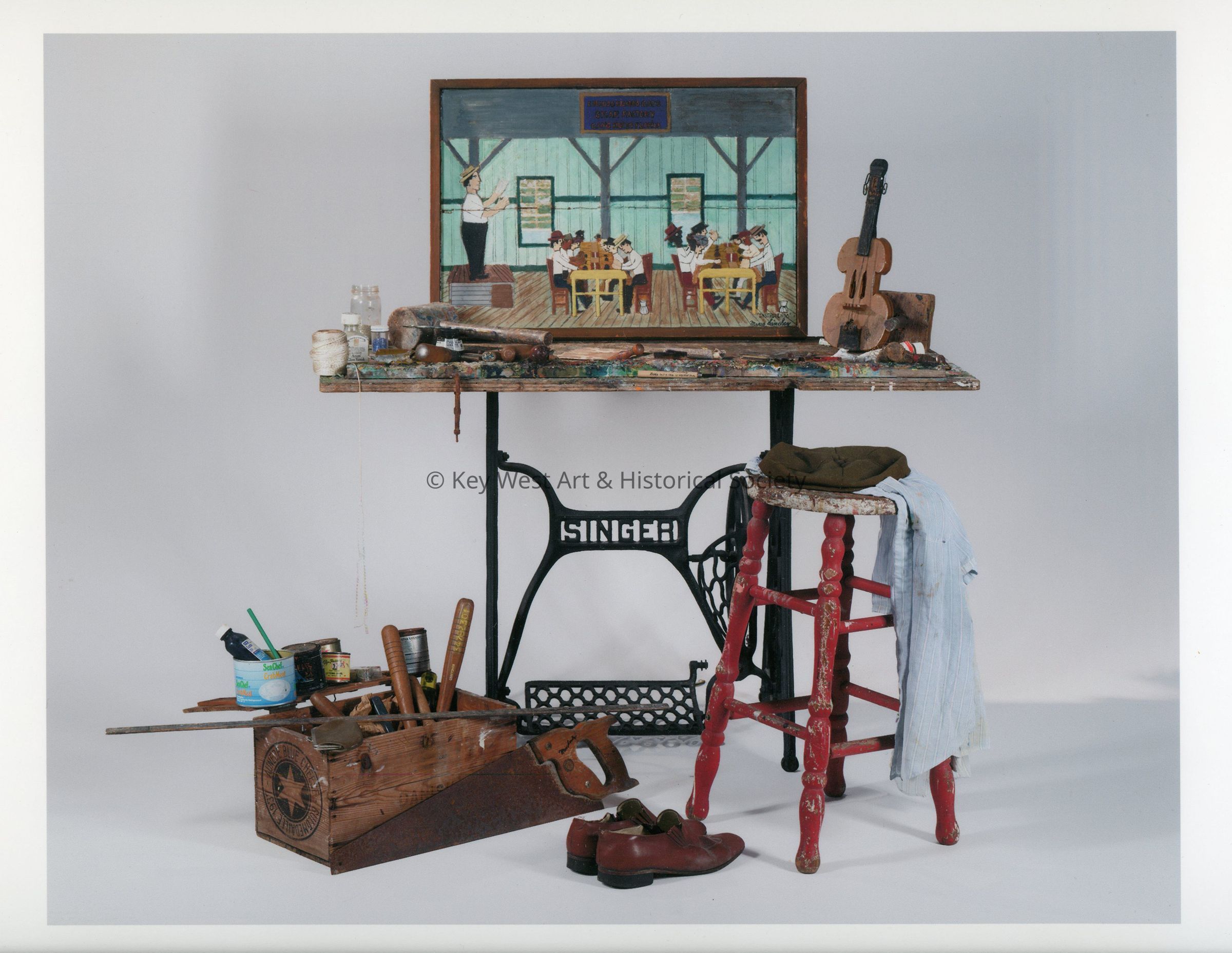 A high quality print of a mock up of Mario Sanchez's workspace The Studio Under the Trees. The print features the intaglio 'Instruyendo'. The print is shrink-wrapped with a piece of white foamcore behind it. Behind the foamcore is a brief description of the image reading 'Abuelo Perico - Instruyendo / Mario's father, Violin - carried by Mario - Nuna, his toolbox, tools, board he carved on, Rita's sewing machine - his mother.'Type of Print