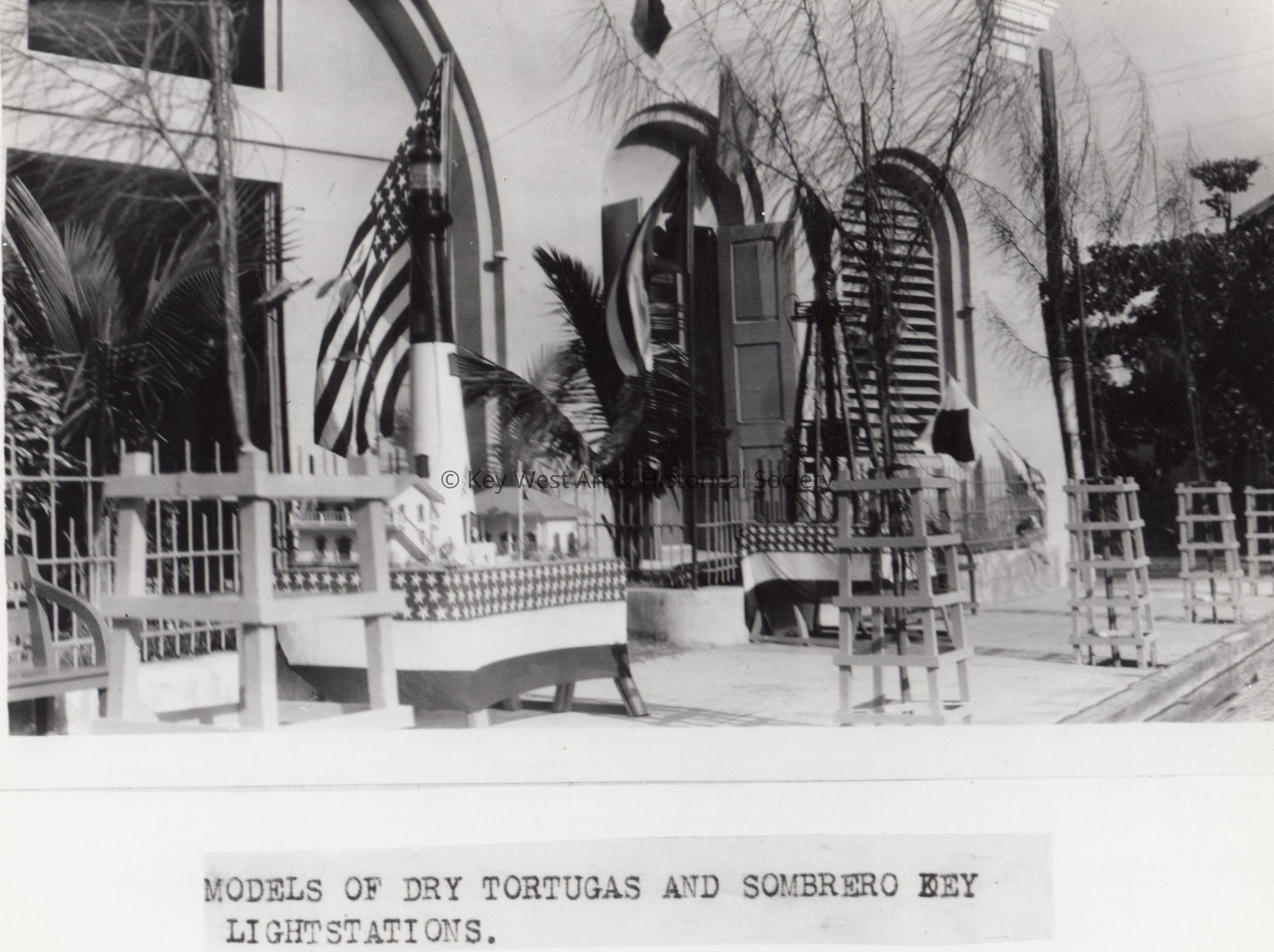 Black and white photograph of models of Dry Tortugas and Sombrero Key Light stations in front of Building 1 at 291 Front Street (presently Clinton Square Market)Photograph Details