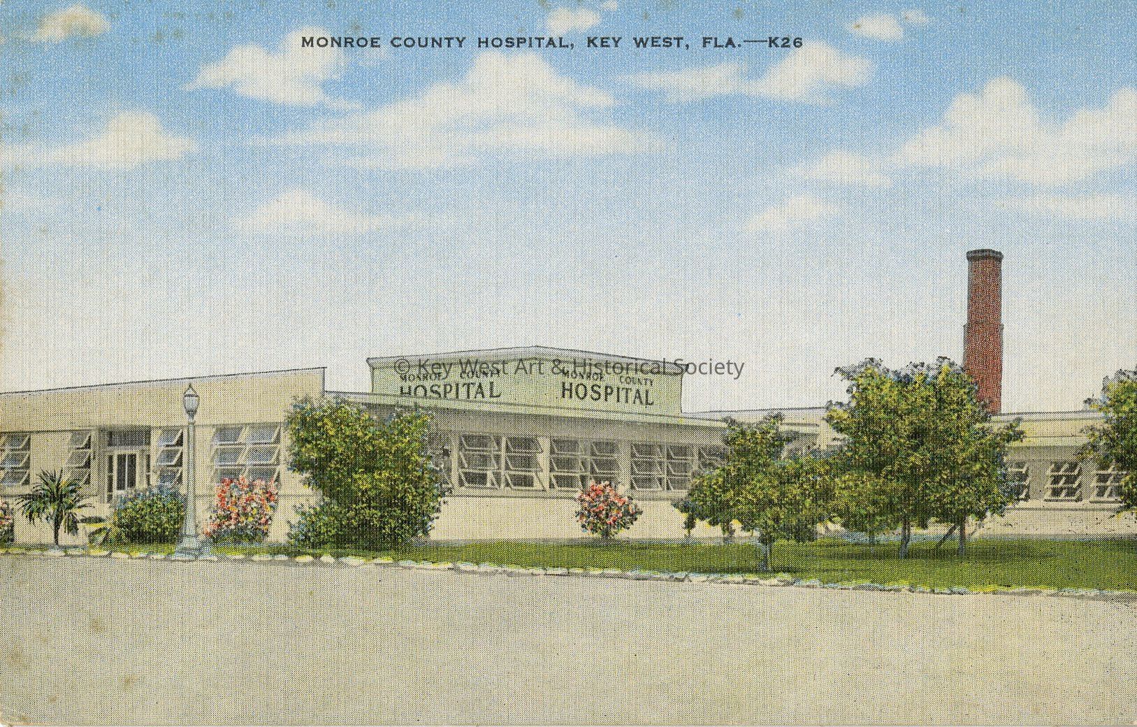 Postcard depicting the Monroe County Hospital in Key West, Florida. Notation on verso, 'The mildness of the winter climate, the moderate temperature and the fresh salt air makes Key West the ideal spot to regain lost health and to enjoy life while doing so. Local doctors and dentists are well equipped , and there is a municipal hospital and several private ones.'Collection