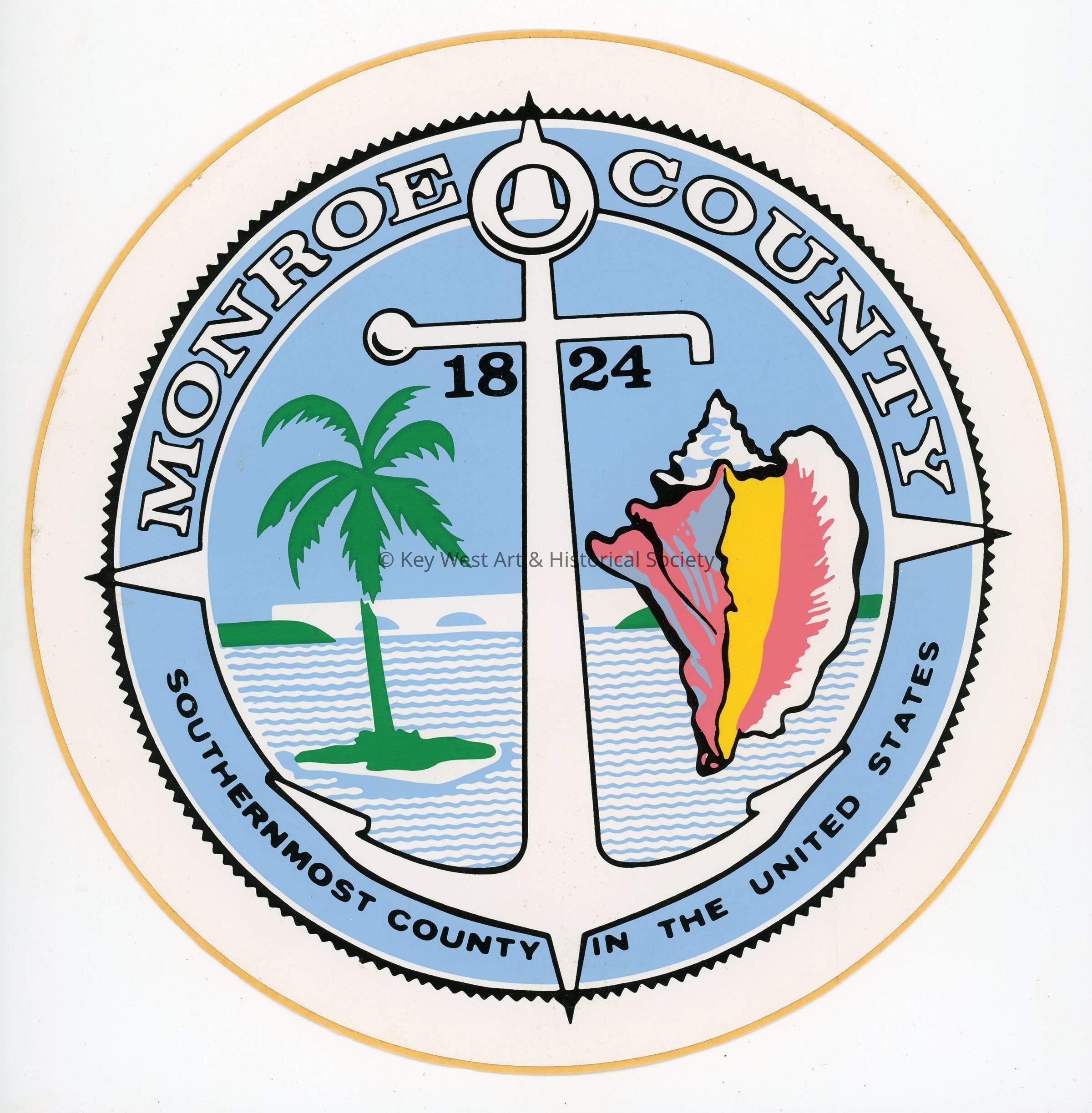 A large round sticker with the seal for Monroe County, the 'Southernmost County in the United States.'Collection