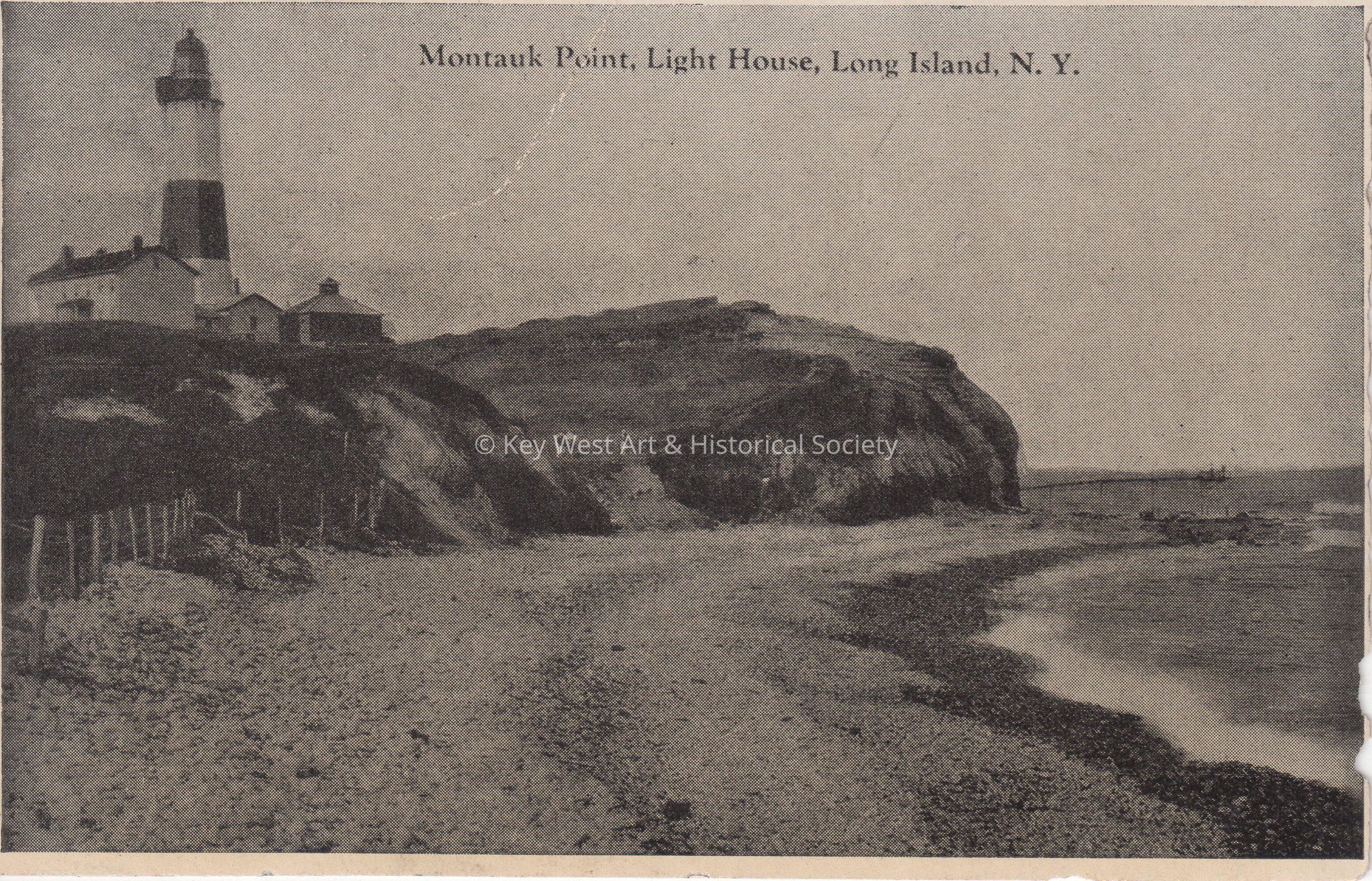 Postcard depicting a lighthouse. The caption reads, ‘Montauk Point, Light House Long Island, New York’.Subject Place
