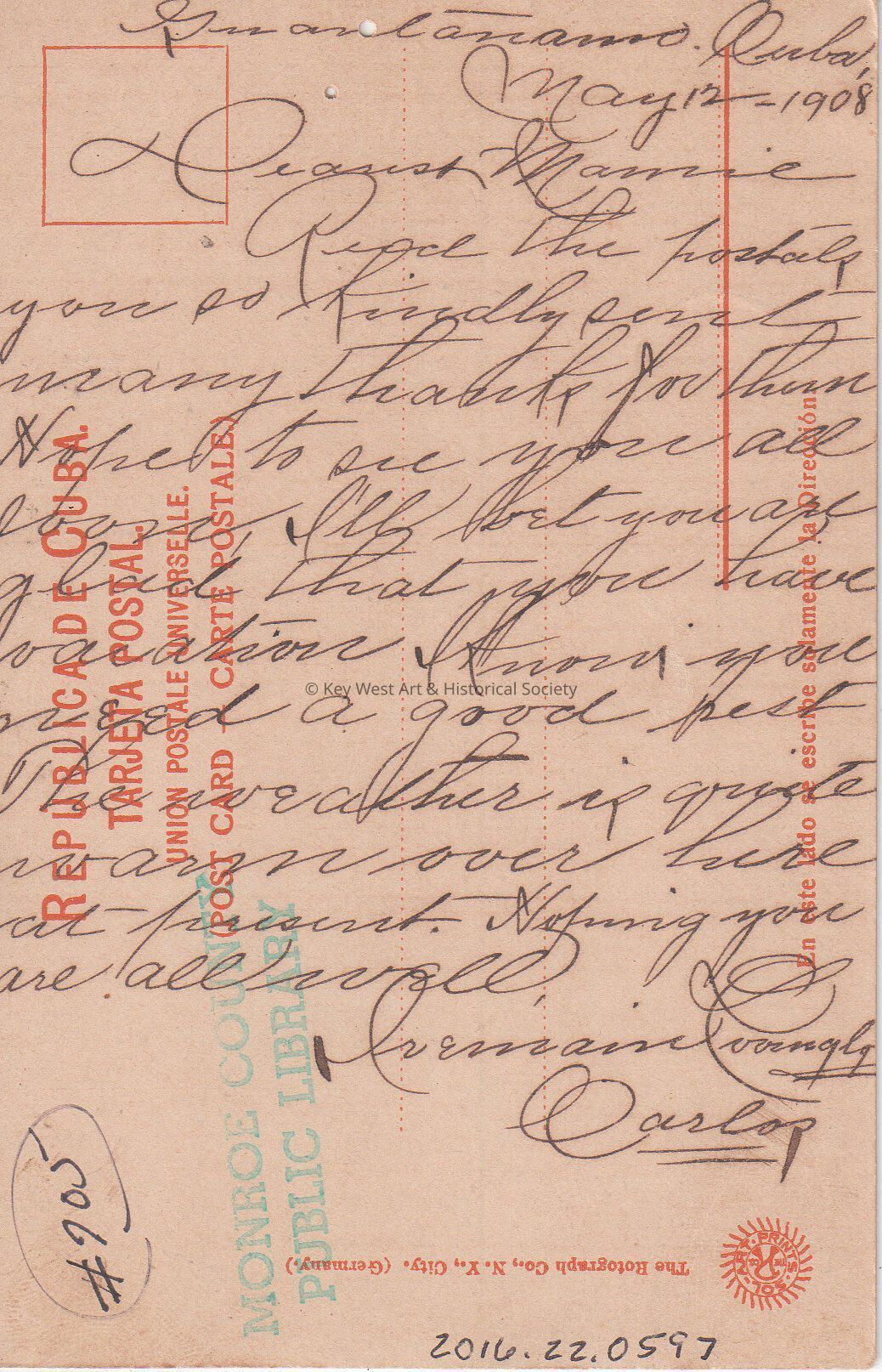 Guantanamo, Cuba, May 12, 1908. Dearest Mamie, Received the postals you so kindly sent. Many thanks for them. Hope to see you all soon. I'll bet you are glad that you have vacation, I know you need a good rest. The weather is quite warm over here at present. Hoping you are all well. I remain lovingly, Carlos.Language