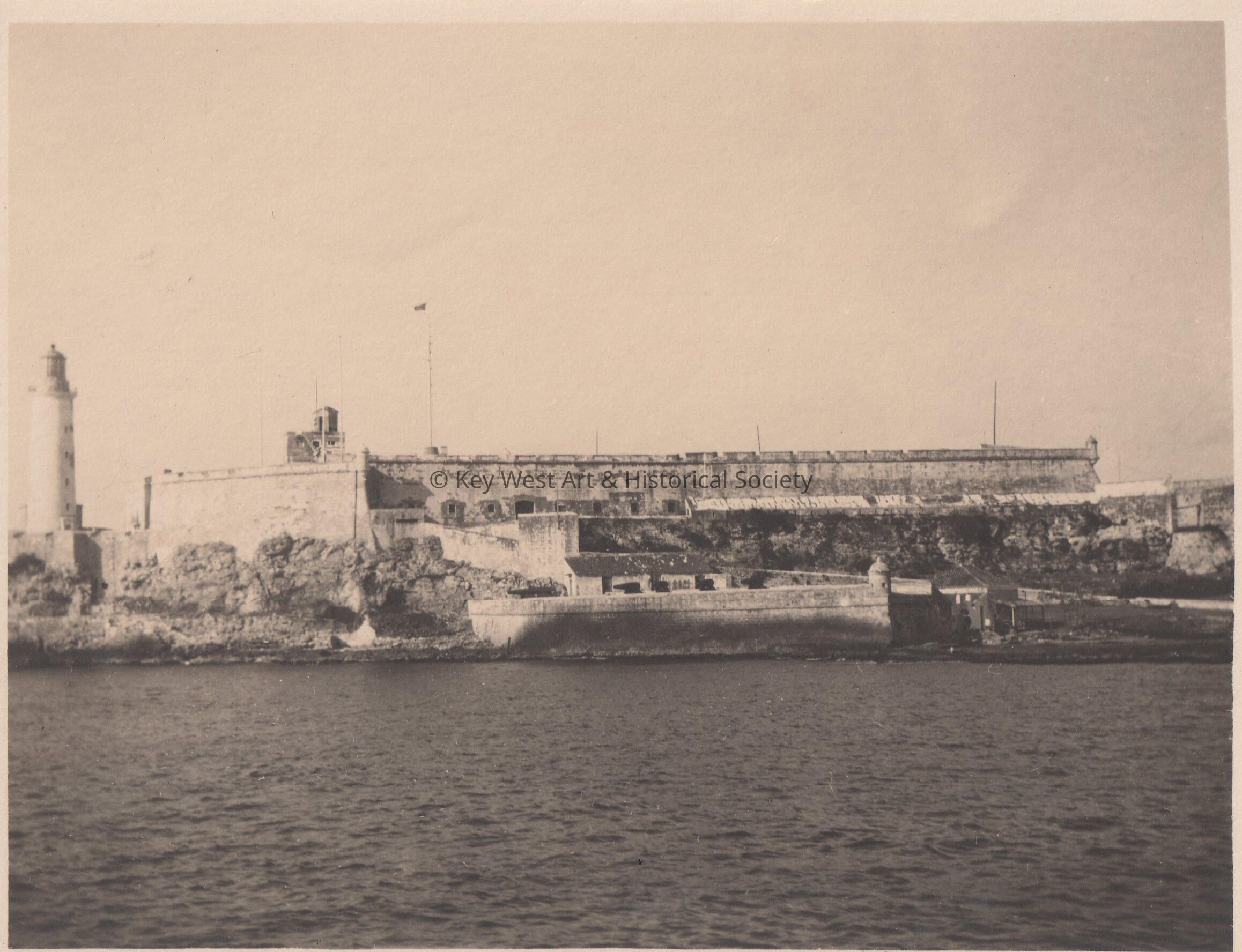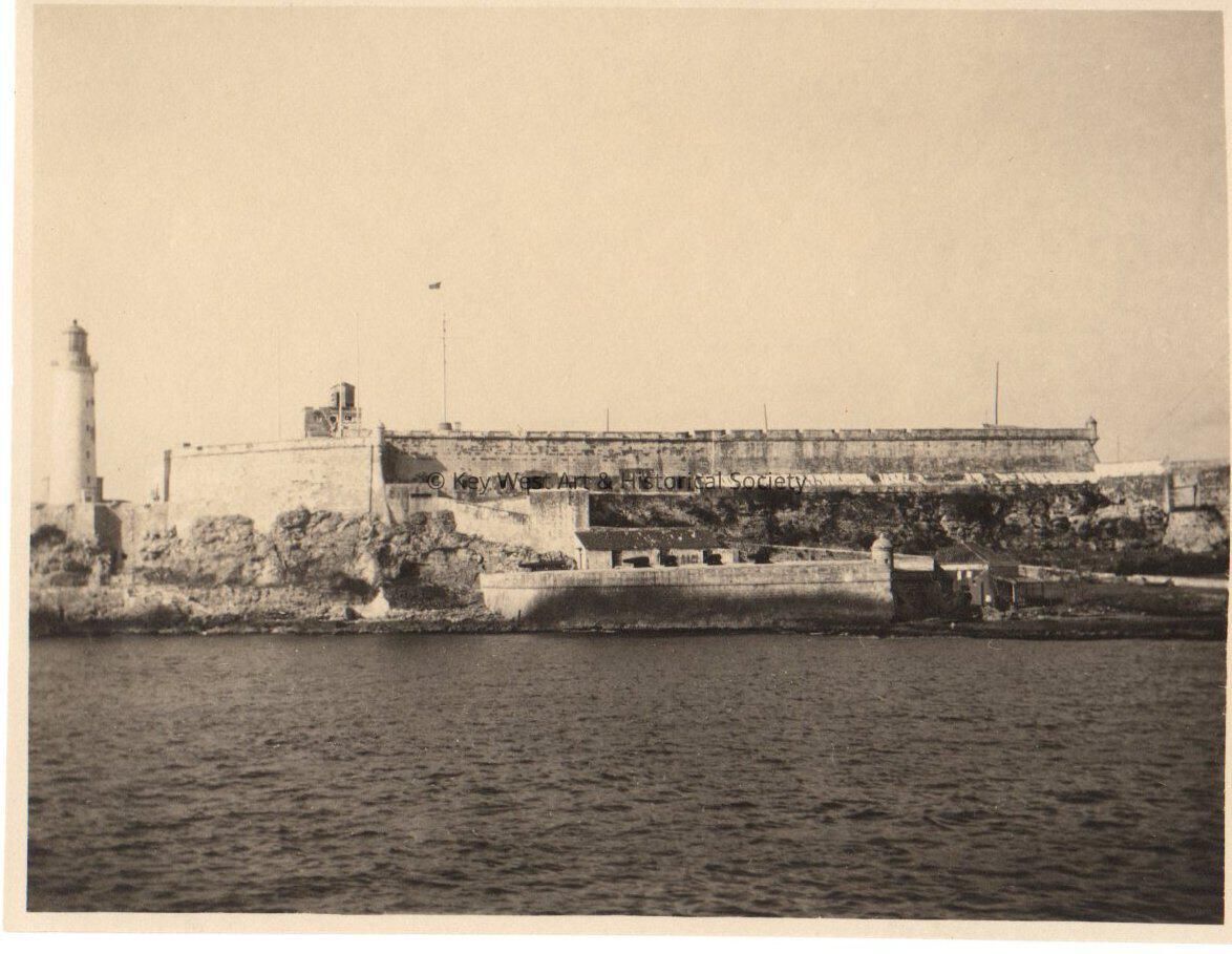 Black and white photo taken in Cuba. Image is taken from a boat and shows a fort with a light house.Collection