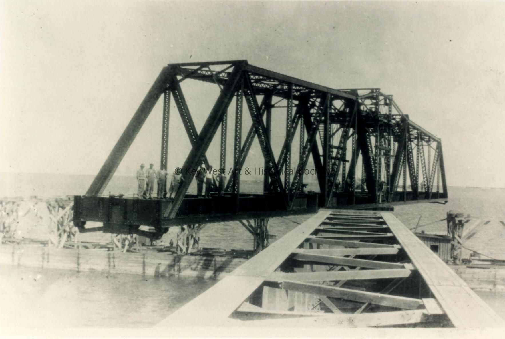 Black and white photograph of the swing bridge over Moser Channel, part of the Seven Mile Bridge, built by the Florida East Coast Railway.