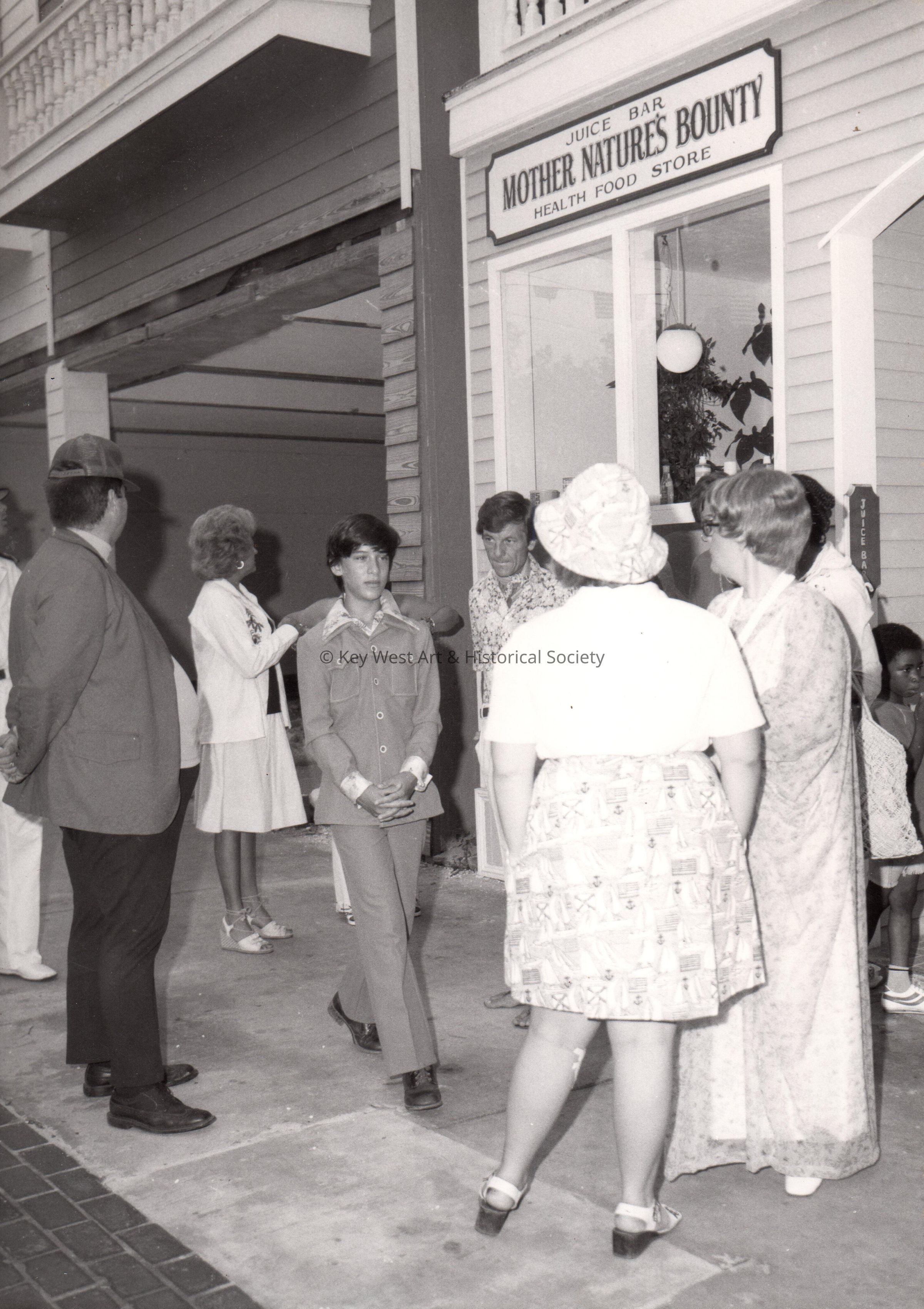 Black and white photograph of a group of people standing outside Mother Nature's Bounty, a juice bar and health food store.