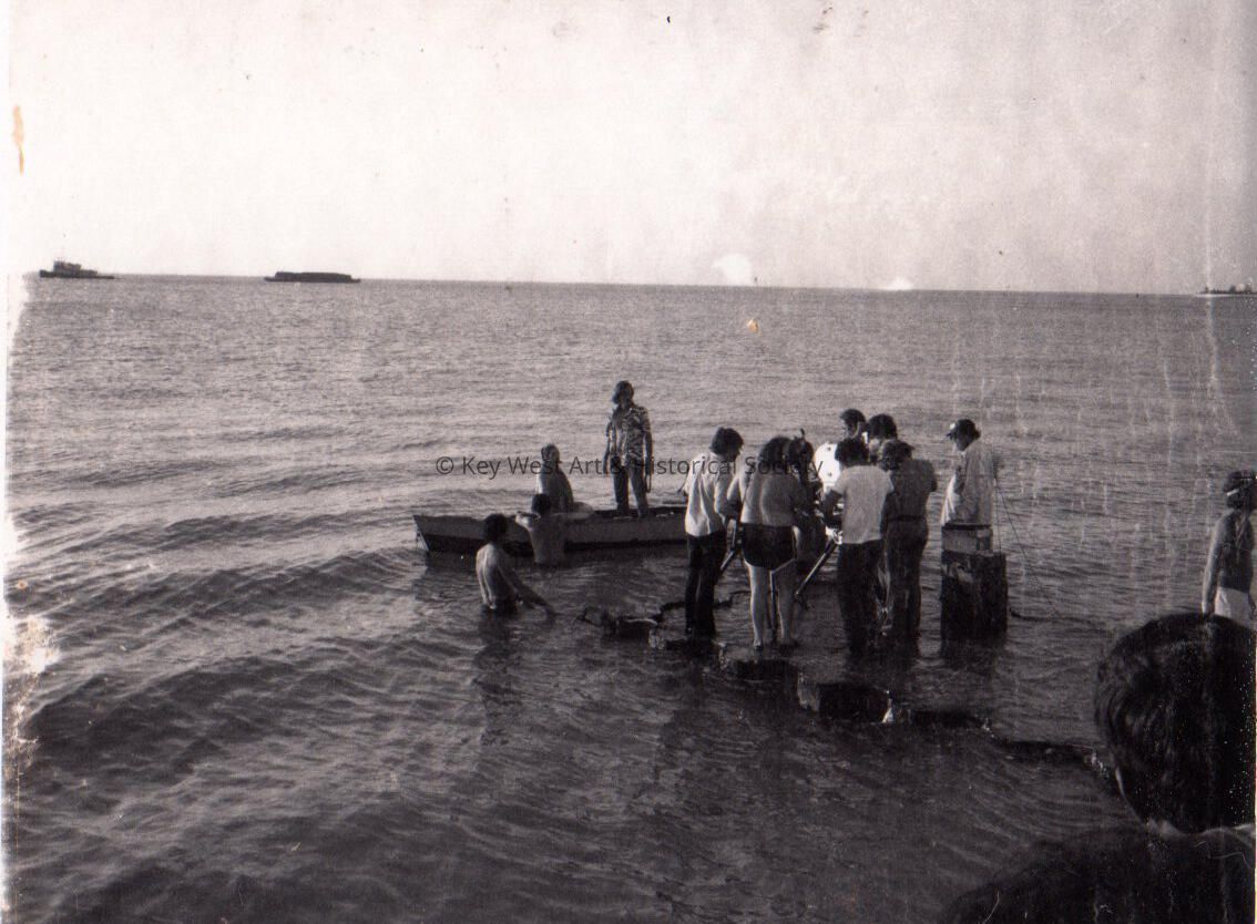 Black and white photograph taken during the filming of the movie '92 in the Shade' featuring Peter Fonda and Margot Kidder.
