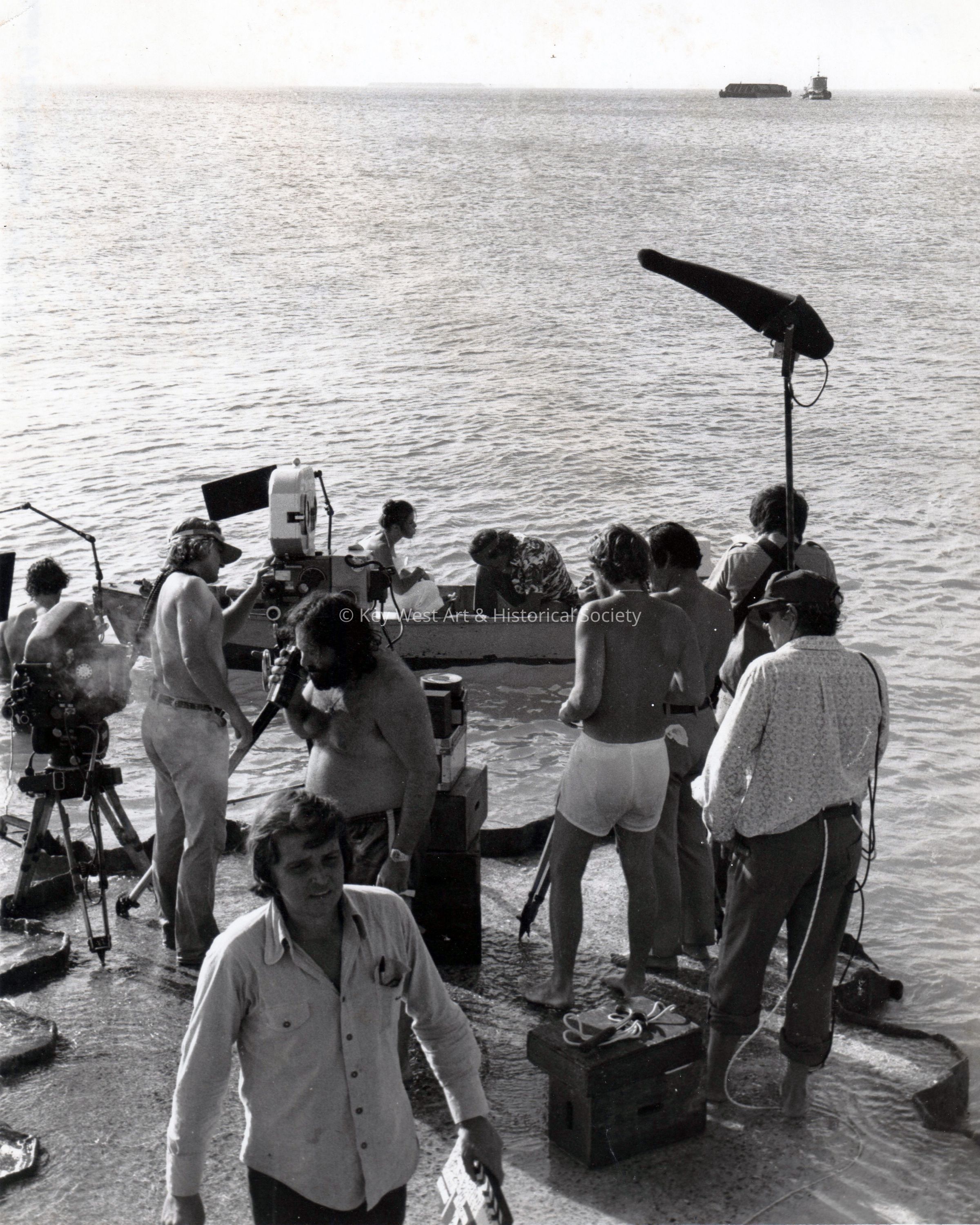Black and white photograph taken during the filming of the '92 in the Shade' with movie crew, Peter Fonda and Margot Kidder, in Key West.