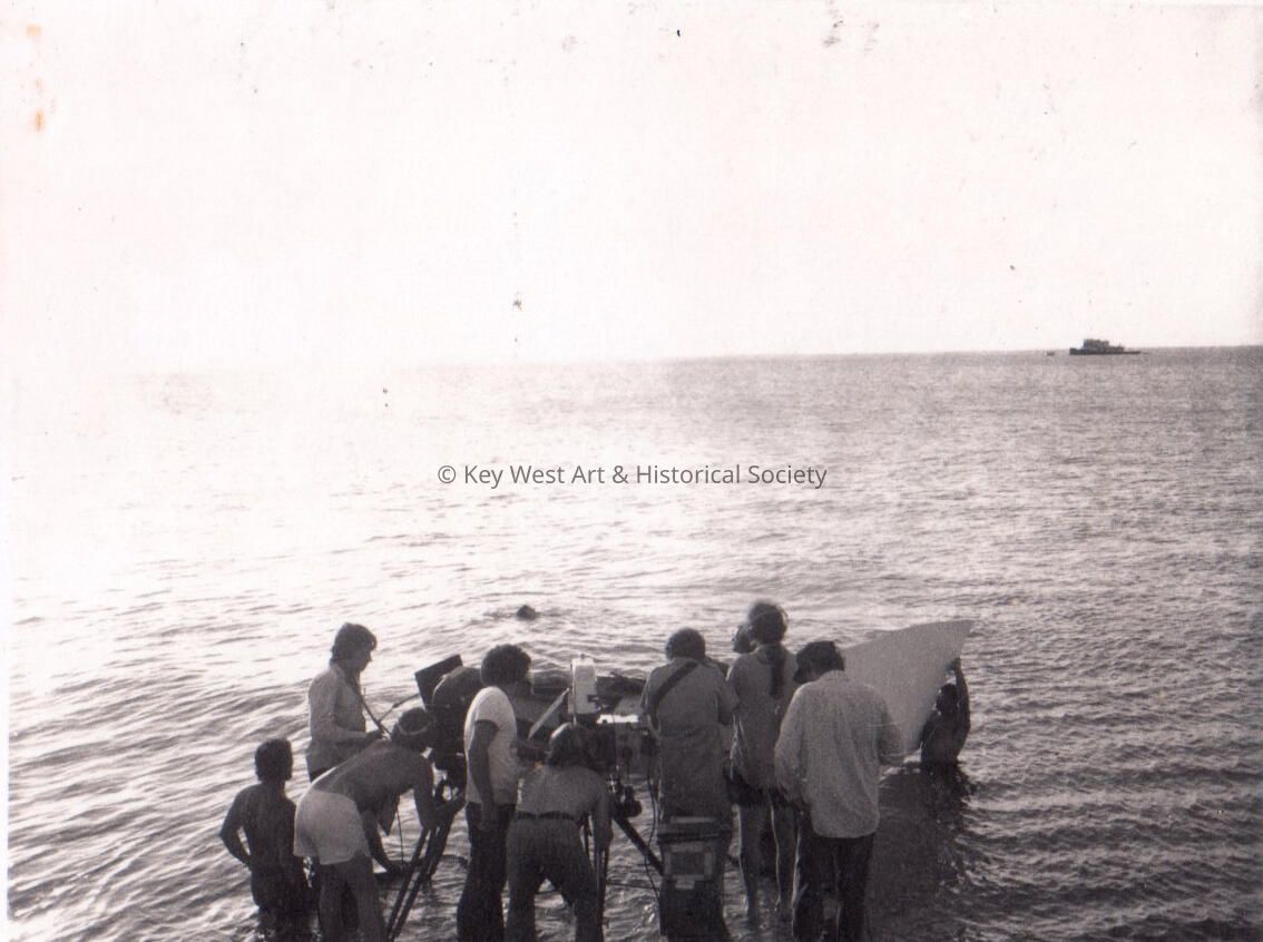 Black and white photograph taken during the filming of the movie '92 in the Shade'.