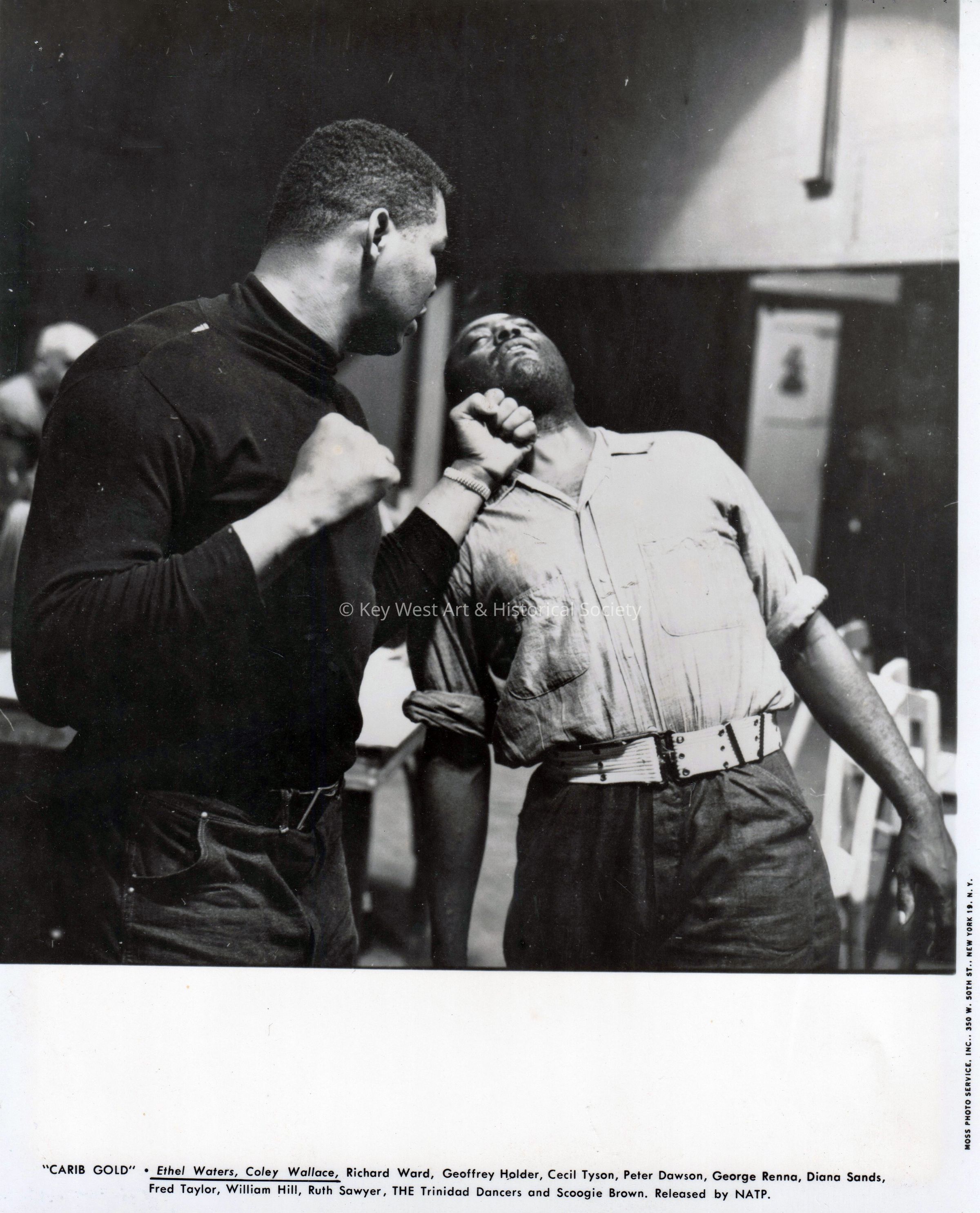 Black and white movie still from Carib Gold starring Ethel Waters and Coley Wallace. Caption reads, '"Carib Gold" • Ethel Waters, Coley Wallace, Richard Ward, Geoffrey Holder, Cecil Tyson, Peter Dawson, George Renna, Diana Sands, Fred Taylor, William Hill, Ruth Sawyer, THE Trinidad Dancers and Scoogie Brown. Released by NATP.'Collection