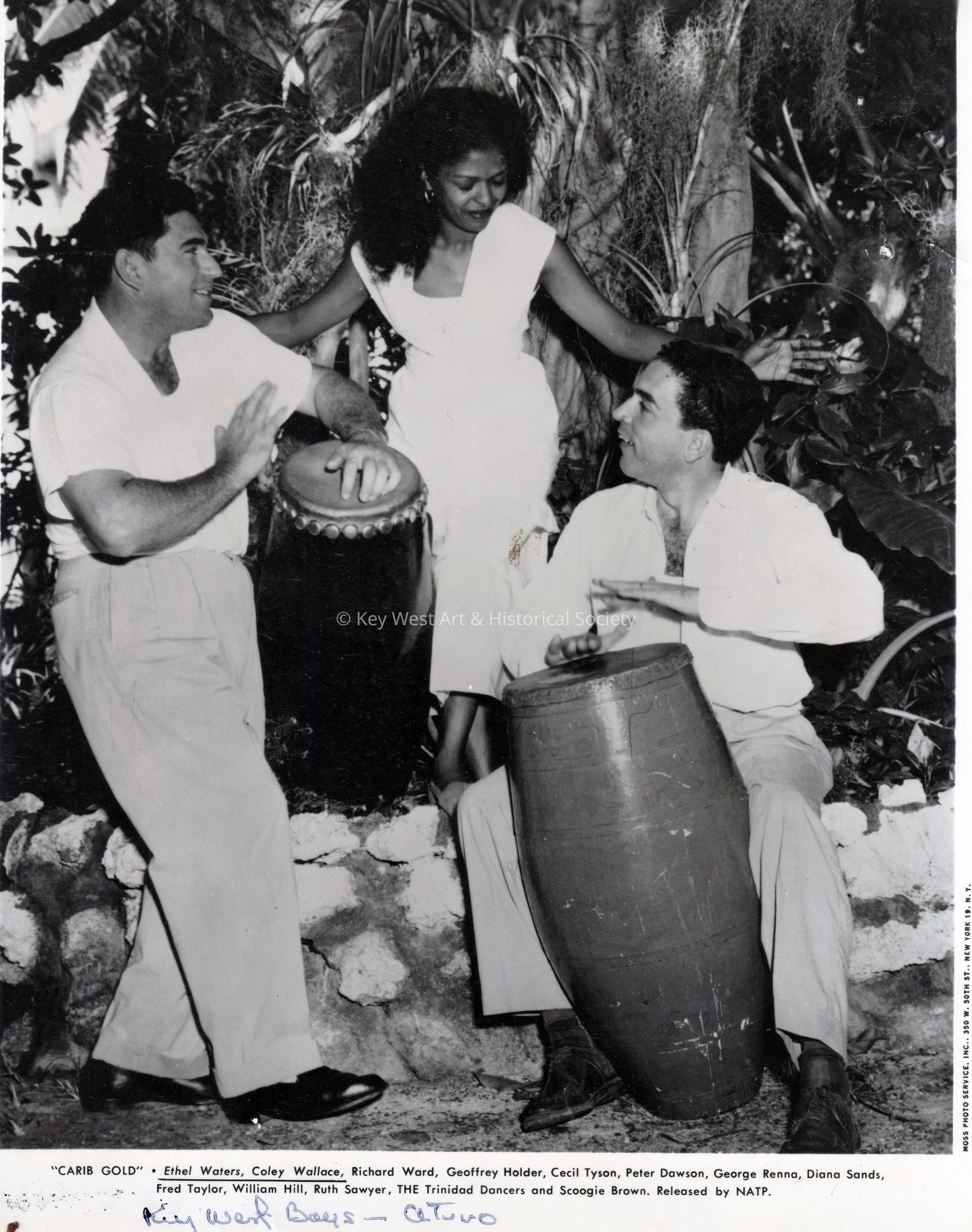 Black and white movie still from Carib Gold starring Ethel Waters and Coley Wallace. Caption reads, '"Carib Gold" • Ethel Waters, Coley Wallace, Richard Ward, Geoffrey Holder, Cecil Tyson, Peter Dawson, George Renna, Diana Sands, Fred Taylor, William Hill, Ruth Sawyer, THE Trinidad Dancers and Scoogie Brown. Released by NATP.' Key West Boys Aturo with drums.Photograph Details