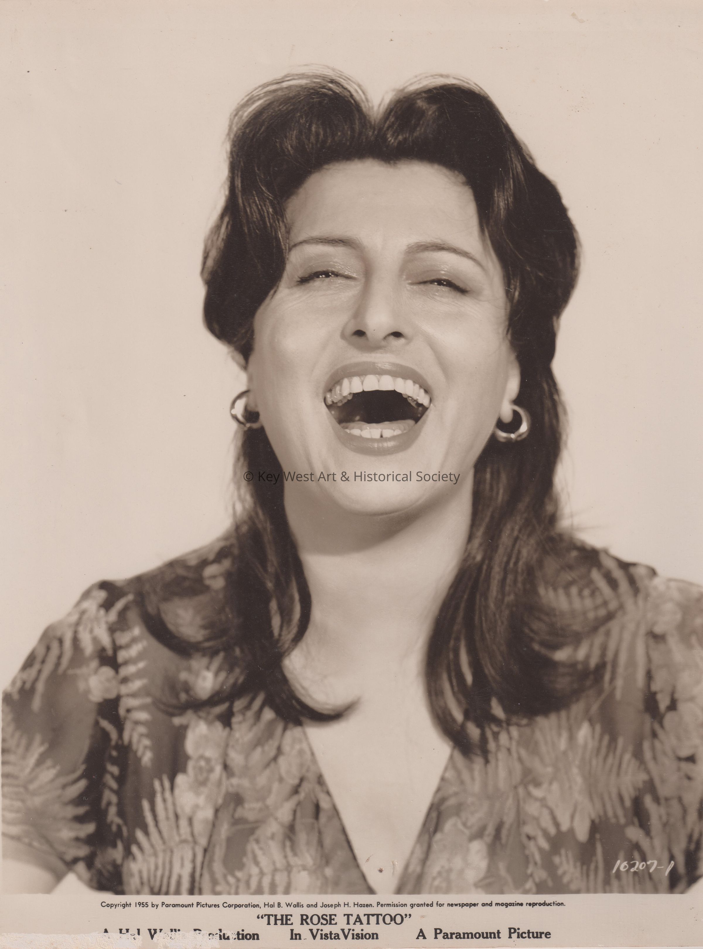 Black and white movie still from 'The Rose Tattoo' by Tennessee Williams featuring Anna Magnani. Photograph distributed by Paramount Pictures Corporation.
