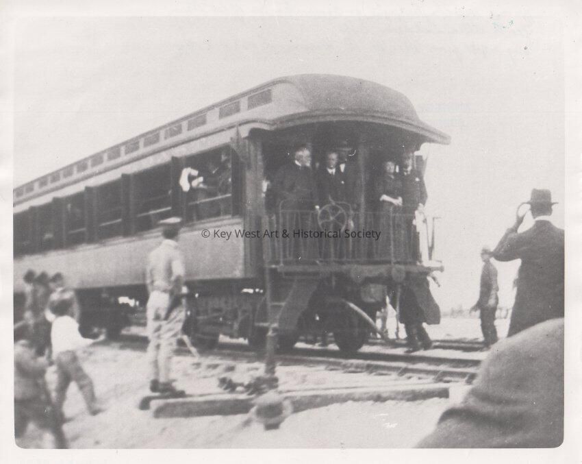 Mr. and Mrs. Flagler (right) on the observation car of the first train and George W. Allen, 2nd from left.Collection