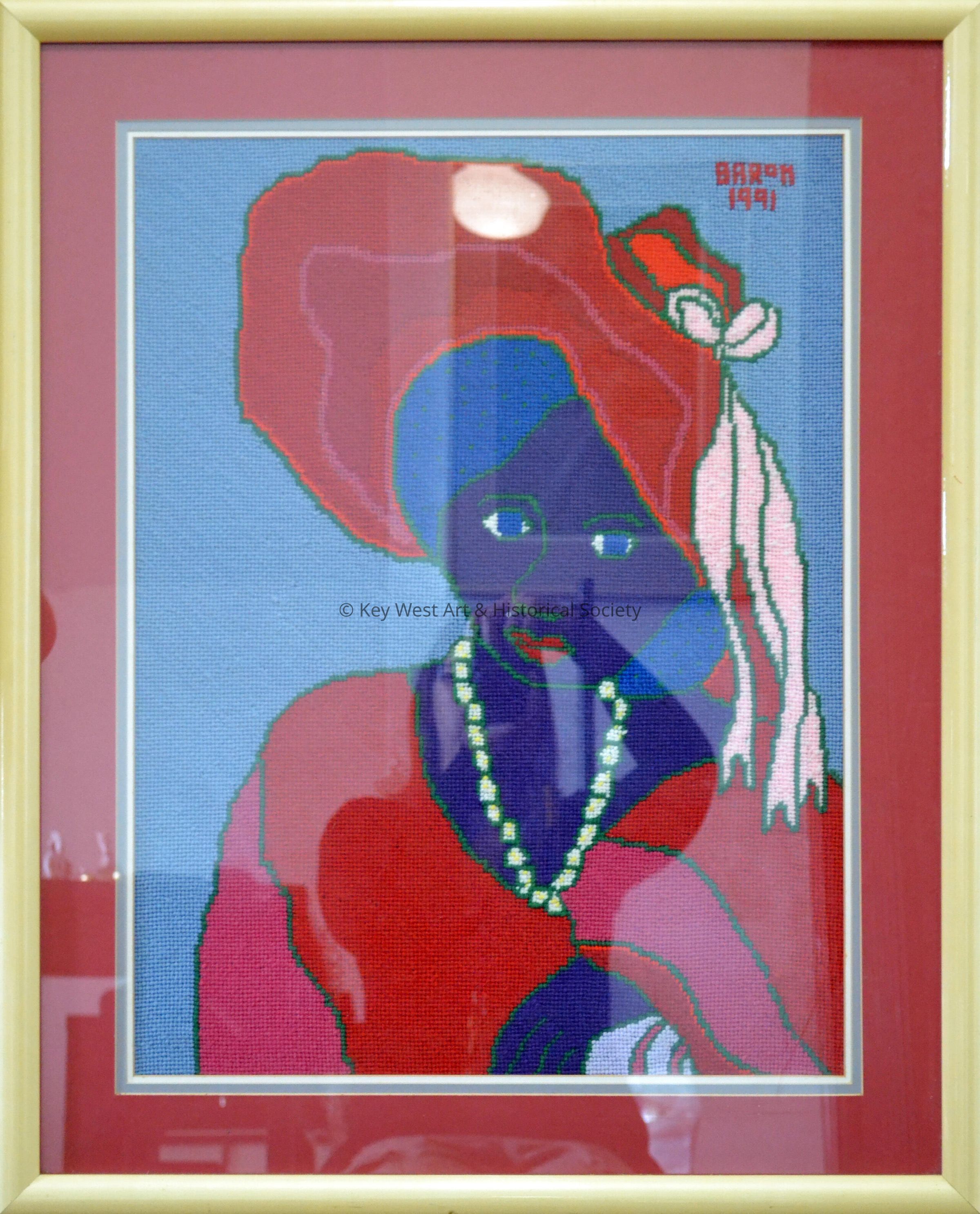 Needlepoint tapestry by Jack Baron depicting a woman (Mrs. Hoey) dressed in a red dress wearing an oversized red hat. She also dons a pearl necklace.Collection
