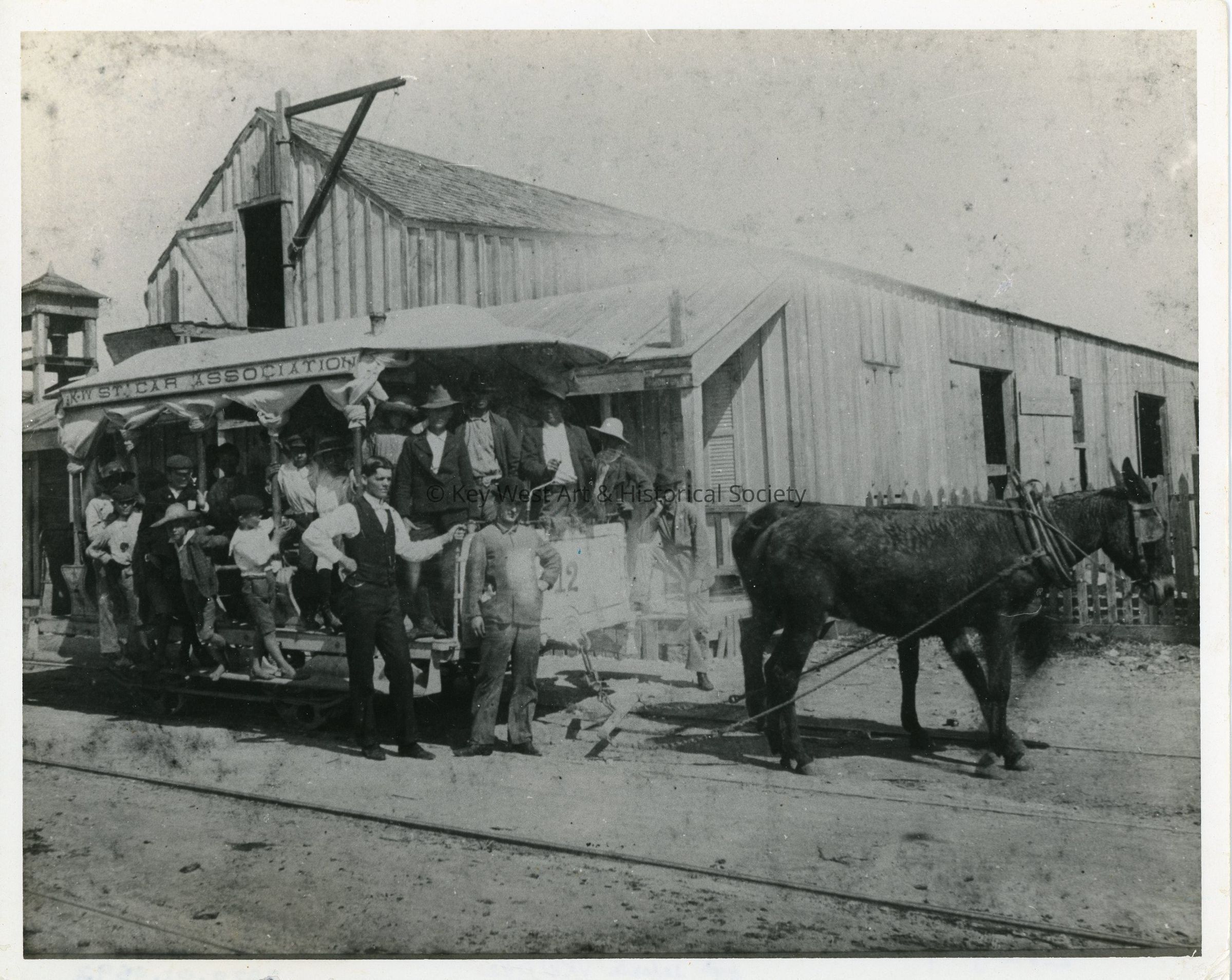 Black and white photograph of a mule drawn streetcar operated by the Key West Street Car Association.