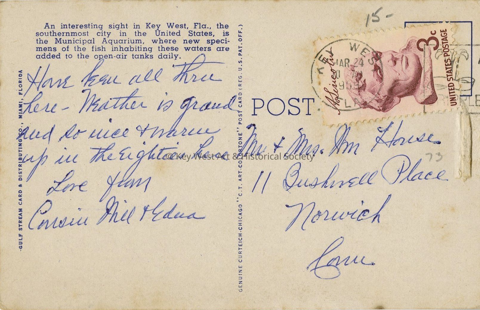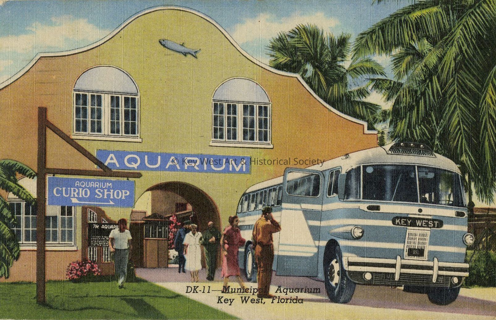 Postcard depicting the Municipal Aquarium in Key West, Florida. Notation on verso, "An interesting sight in Key West, Florida, the southernmost city in the United States, is the Municipal Aquarium, where new specimens of the fish inhabiting these waters are added to the open-air tanks daily."Collection