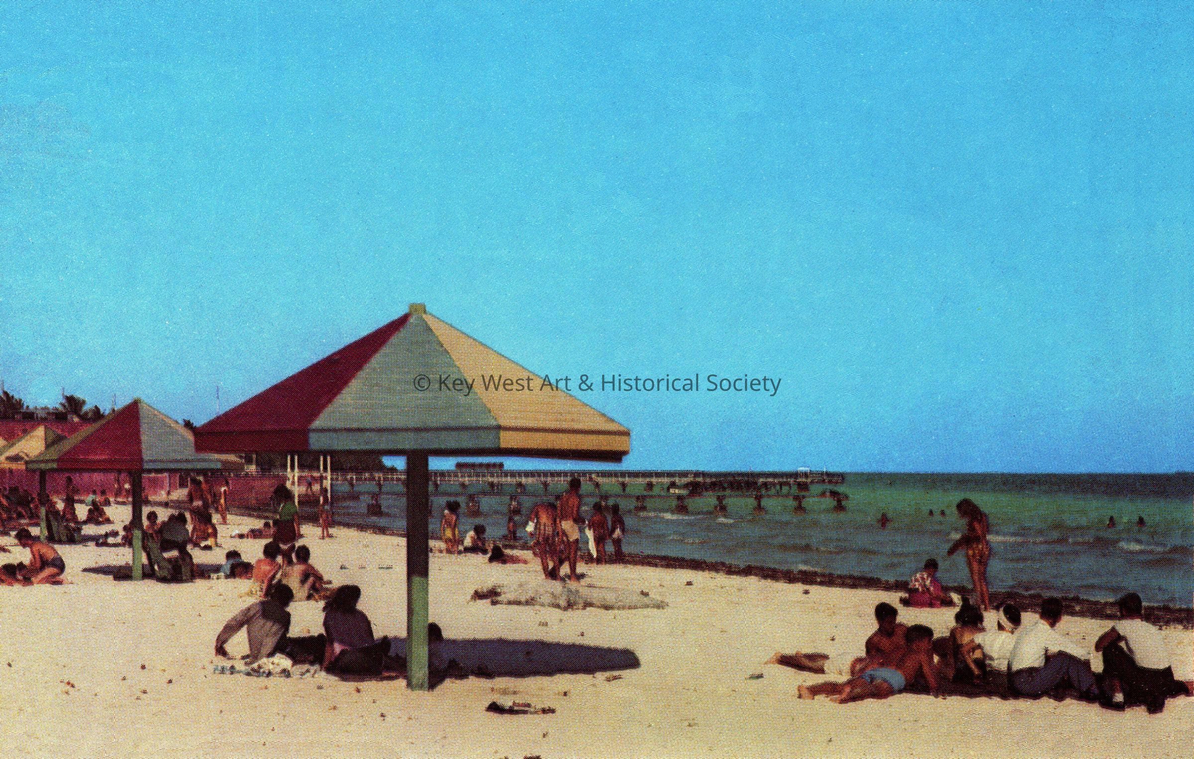 Postcard depicting a crowd on a beach under cabanas near a pier. The description on the verso reads, 'Municipal South Beach, Key West, Florida.'Subject Place