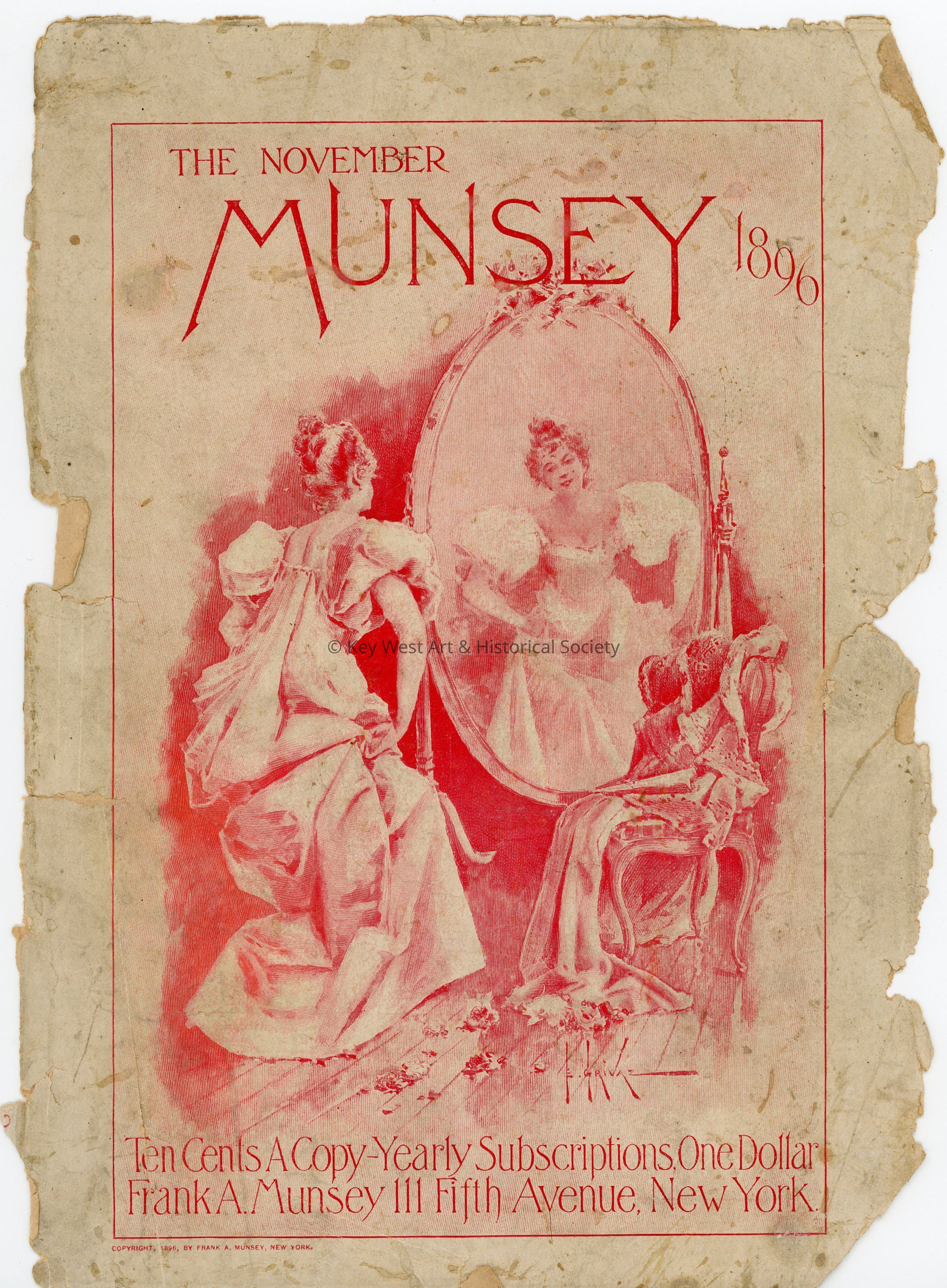 The front cover of the November 1896 edition of Munsey's Magazine. The artwork on the cover was done by the artist Eugène Grivaz (1852-1915) and features in red a woman holding her dress in front of a mirror.
