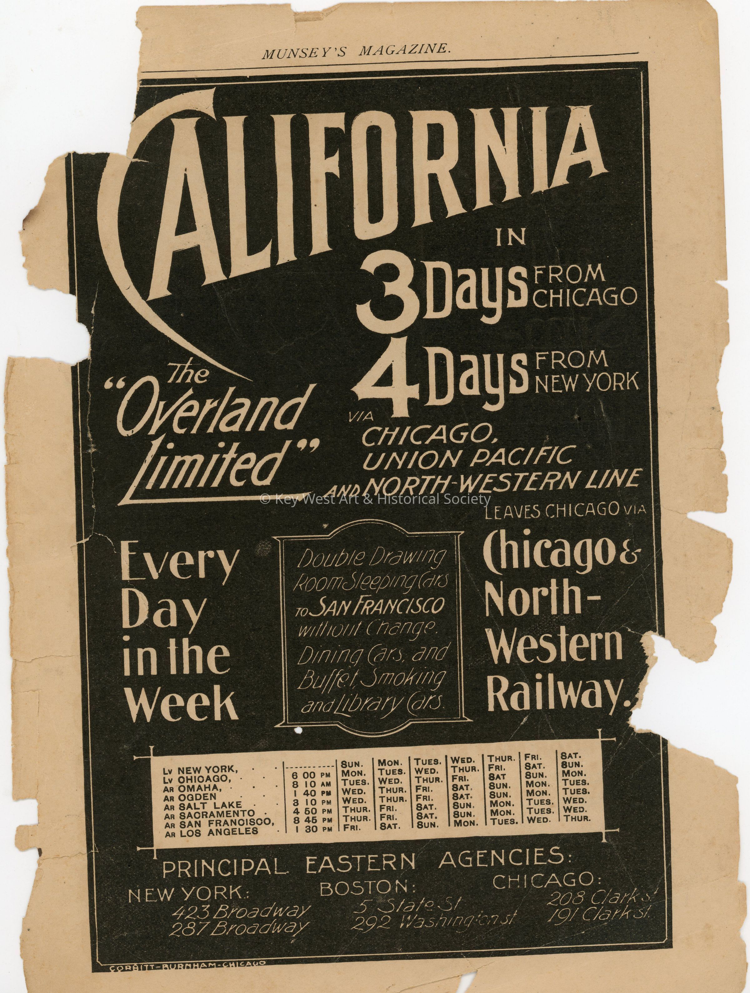 A leaf from the November 1896 edition of Munsey's Magazine, likely the back cover page. Both sides feature advertisements including ads for The Overland Limited Union Pacific train and Armour & Company's Extract of Beef.Collection