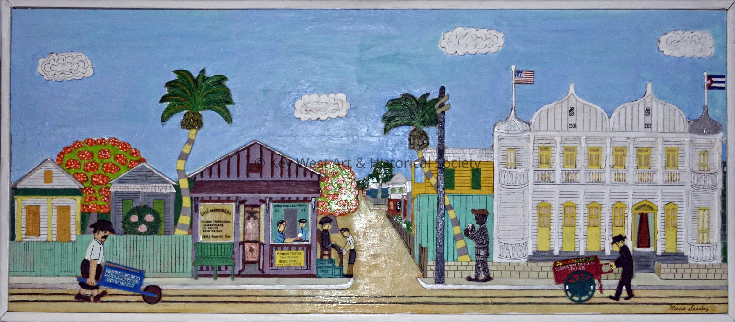 Wood carving by Mario Sanchez depicting the Cuban Club at the corner of Duval and Amelia streets. In the center of the carving is a young Mario Sanchez operating his shoe shine business.Type of Sculpture