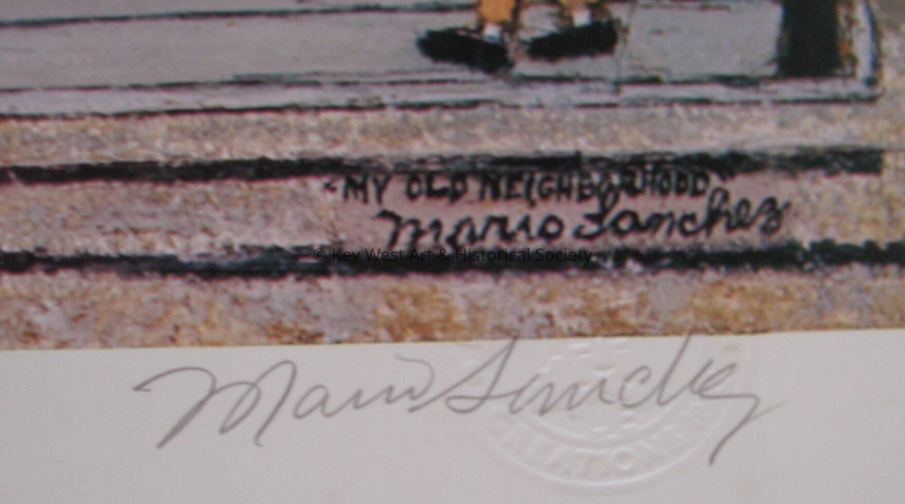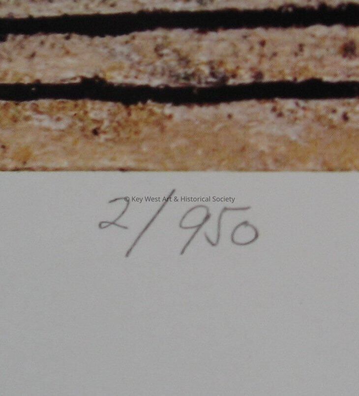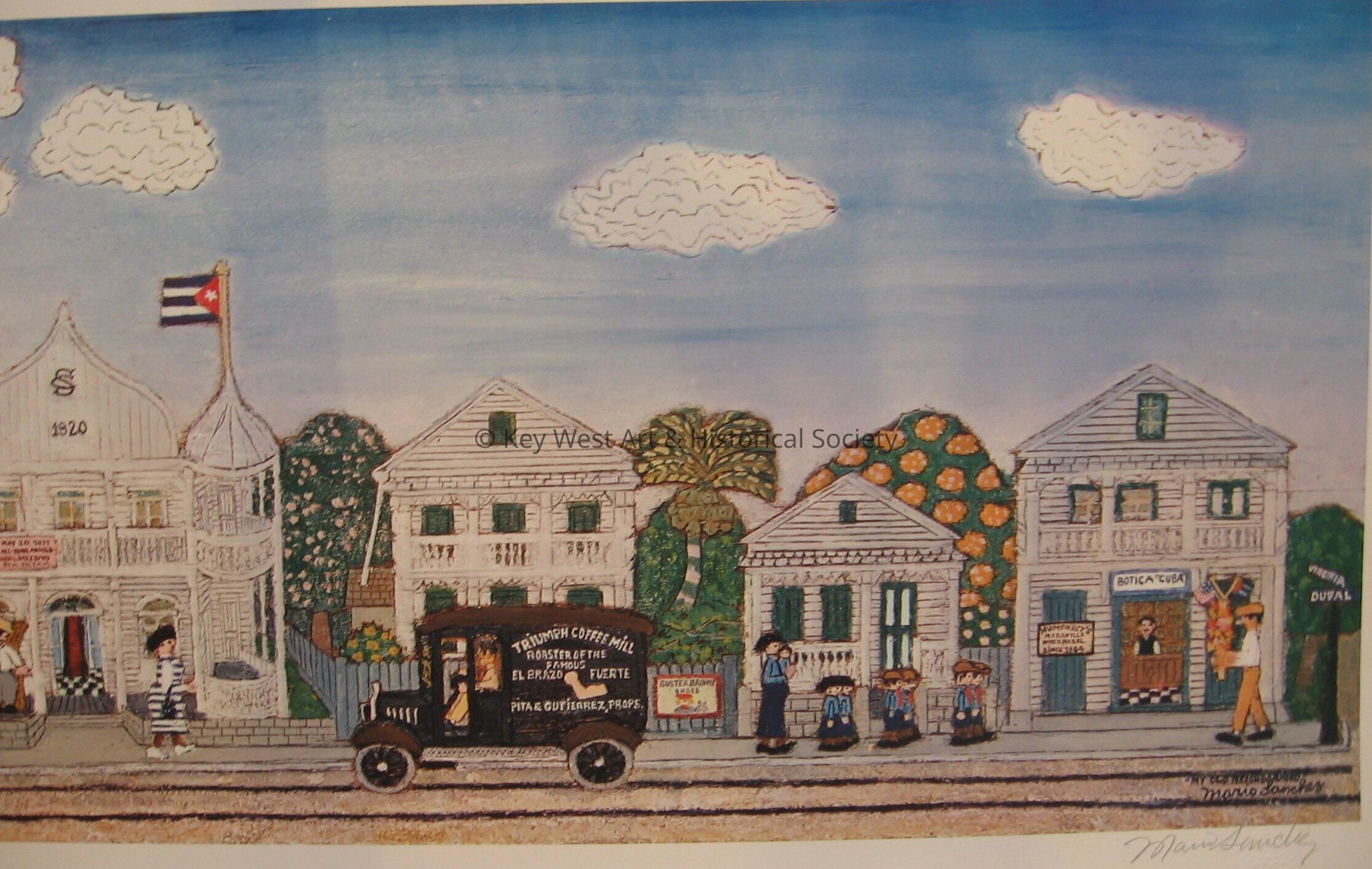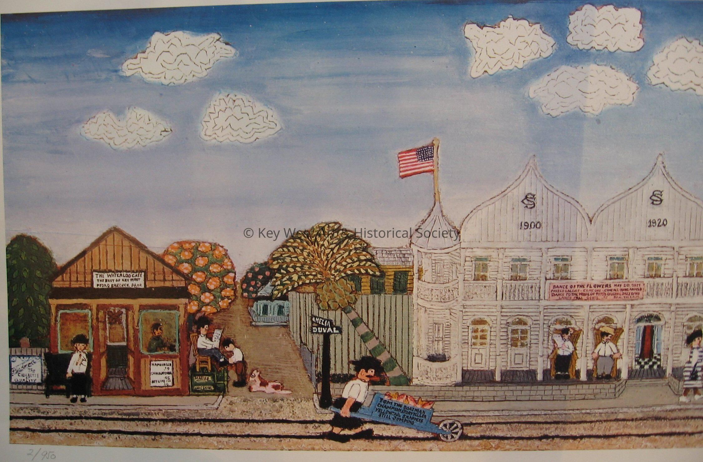 Colored print, stamped and signed, numbered 2 of 950. Street scene of Duval between Amelia and Virginia. Tom the Boatman is pushing a wheel barrel of yellowtails and snapper down the road, a truck for triumph coffee mill is driving down the street. The Waterloo Café, Cuban Club, and Botica Cuba are all in the background. Copied from My Old Neighborhood 1987.01.3204Collection