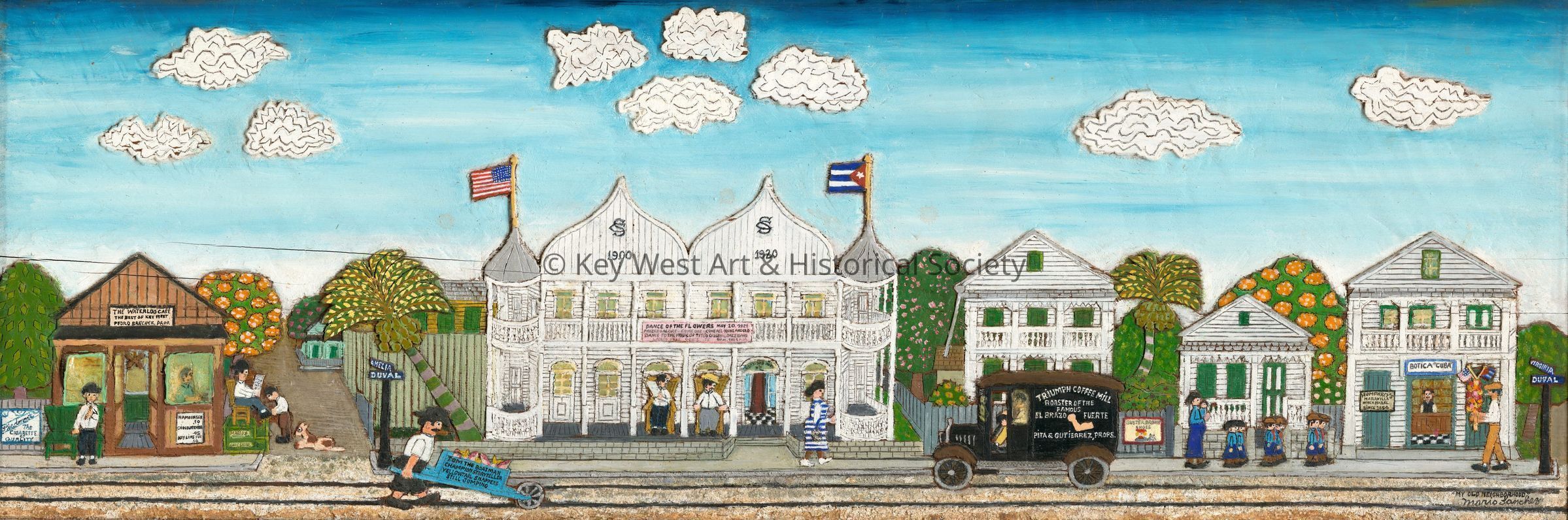 Woodcarving by Mario Sanchez depicting the Cuban Club at 1108 Duval Street. There are school children walking down the street, and a man pushing a wheelbarrow of fish. Two pieces of wood bolted and glued together.