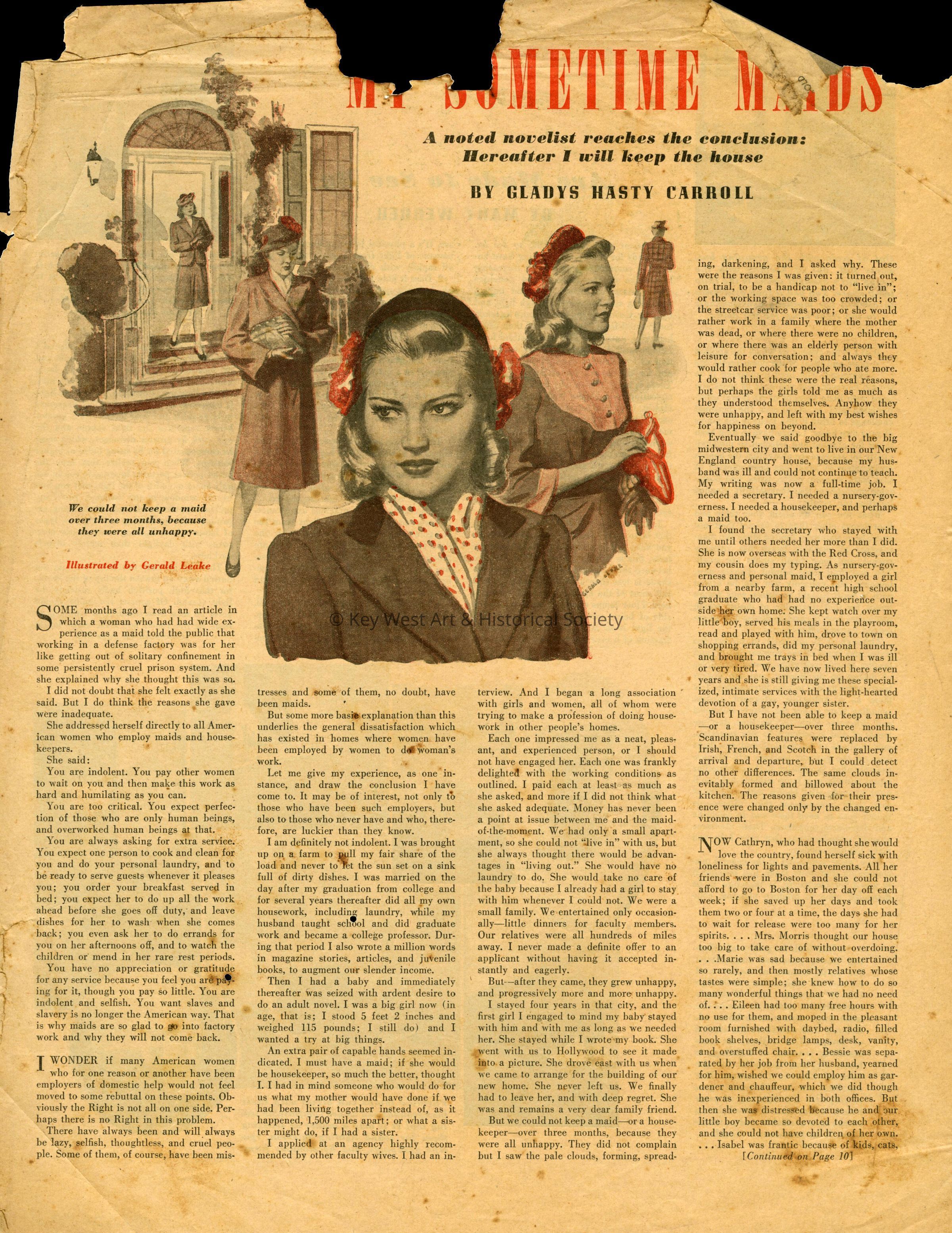 Magazine serial story entitled 'My Sometime Maids' written by Gladys Hasty Carroll and illustrated by Gerald Leake. The serial appeared in Household Magazine.