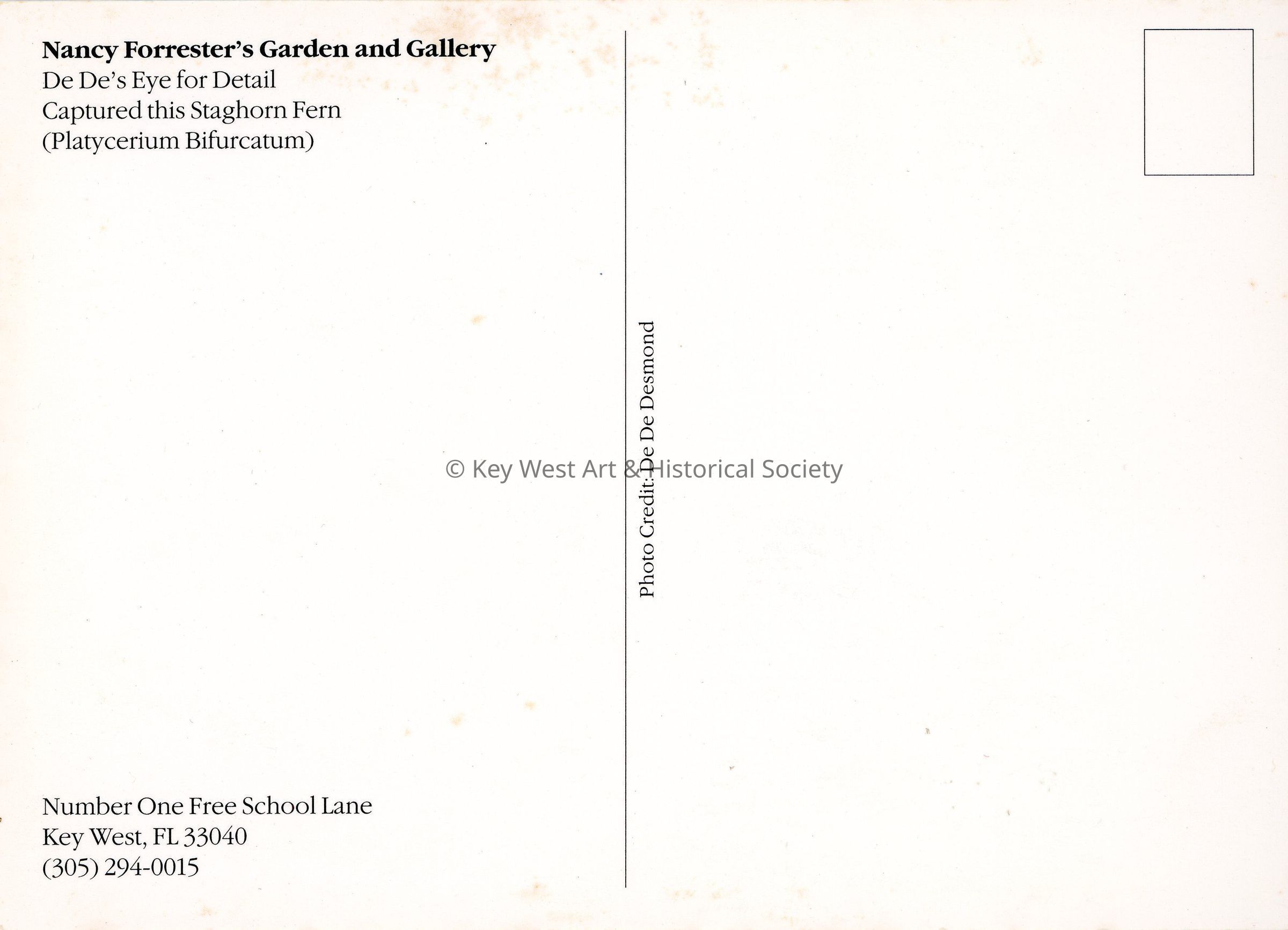 Postcard depicting a staghorn fern. Notation on verso reads 'Nancy Forrester's Garden and Gallery. De De's Eye for Detail Captured this Staghorn Fern (Platycerium Bifurcatum).' The Garden was formerly located at 1 Free School Lane.Subject Place