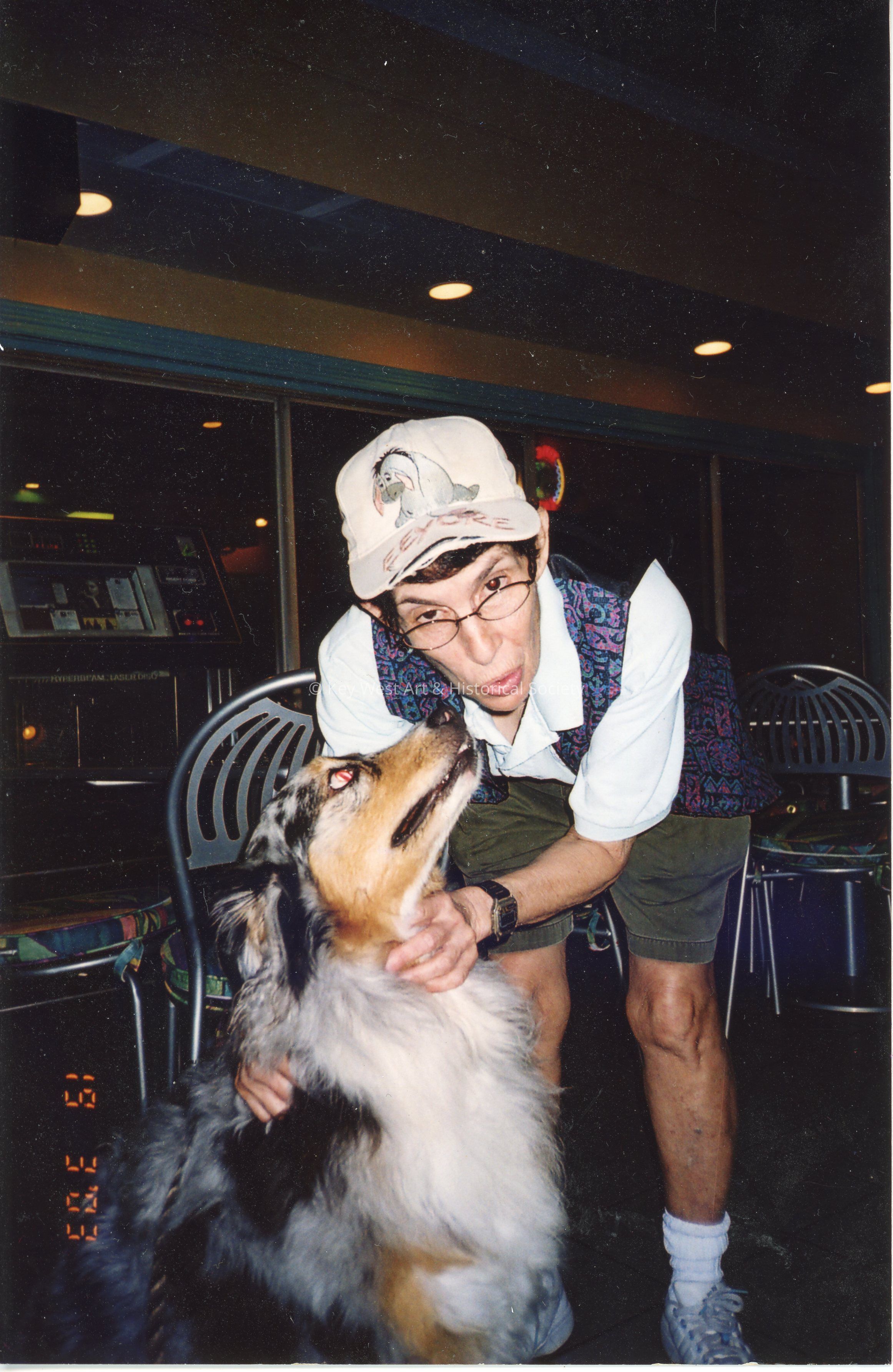 Photograph of Nancy Loewy with a dog named Gracie at Diner Shores of the Atlantic Shores Resort at 510 South Street. Photo taken in April of 2003.