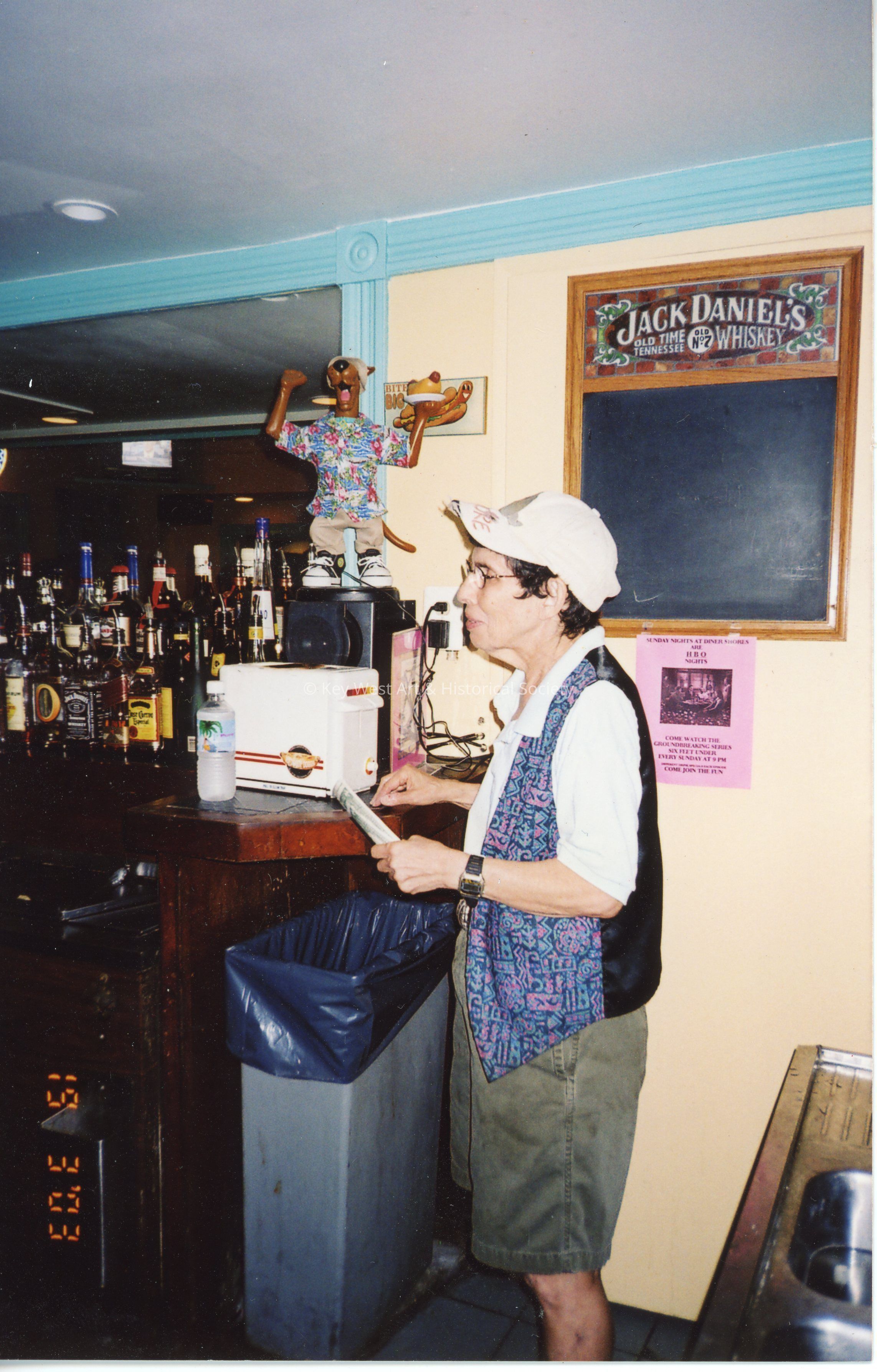 Photograph of Nancy Loewy at the bar at Diner Shores of the Atlantic Shores Resort at 510 South Street. Behind Nancy is a figurine of Scooby-Doo holding a hot dog.
