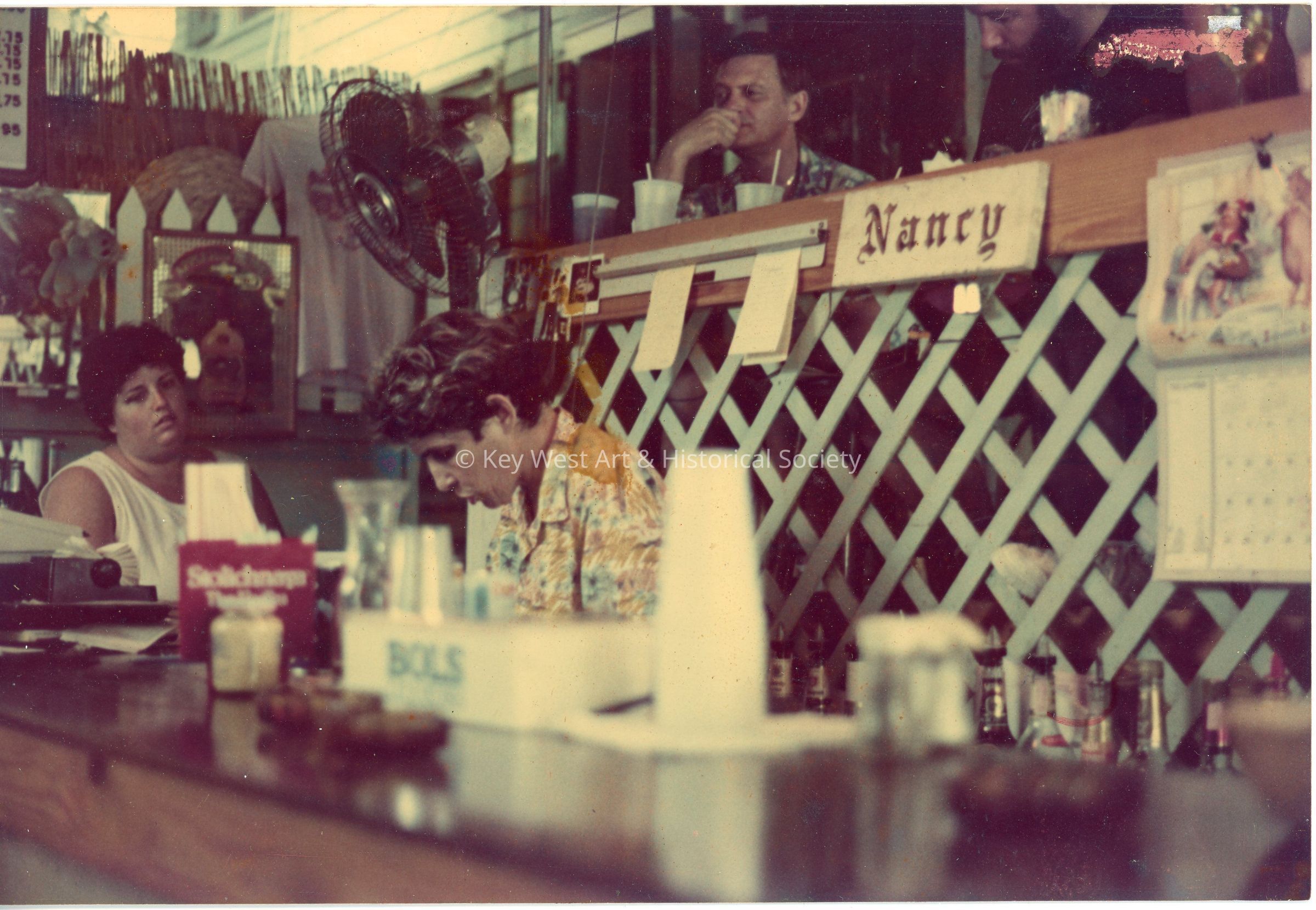 Nancy Loewy behind the bar serving patrons at the Pigeon House Patio Restaurant and Bar formerly located at 301 Whitehead Street.