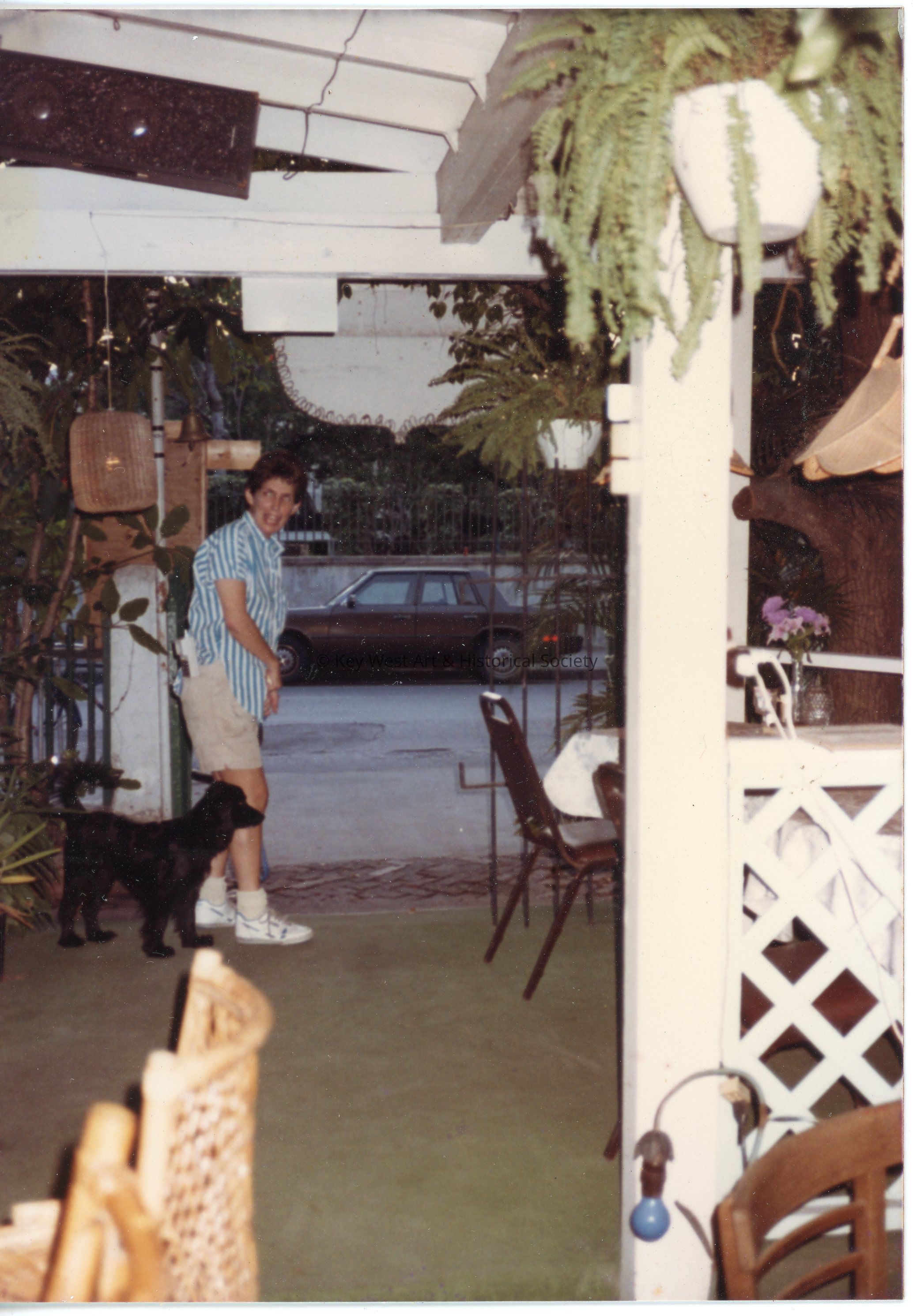 Nancy Loewy and a dog named Gracie at the entrance to the veranda at the Pigeon House Patio Restaurant and Bar formerly located at 301 Whitehead Street.