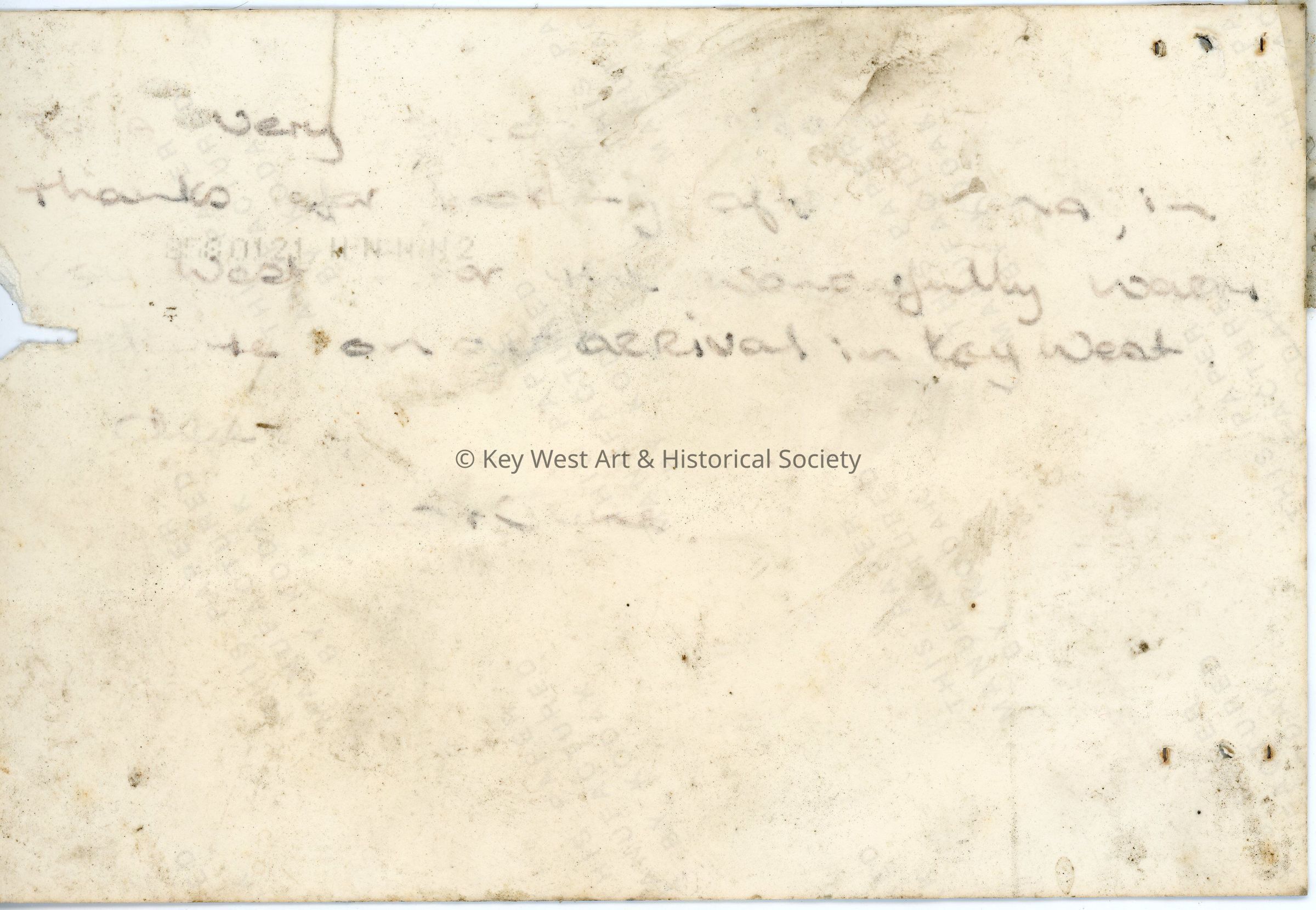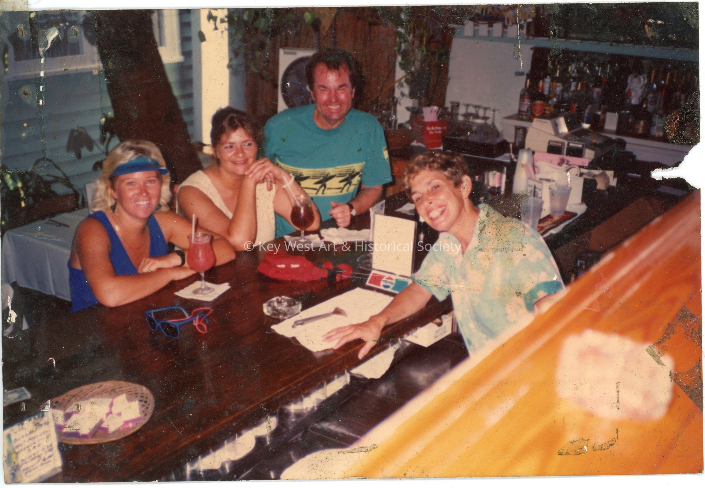 Nancy Loewy and three (3) patrons at the Pigeon House Patio Restaurant and Bar formerly located at 301 Whitehead Street. There is a partially illegible handwritten note on the back of the photo.