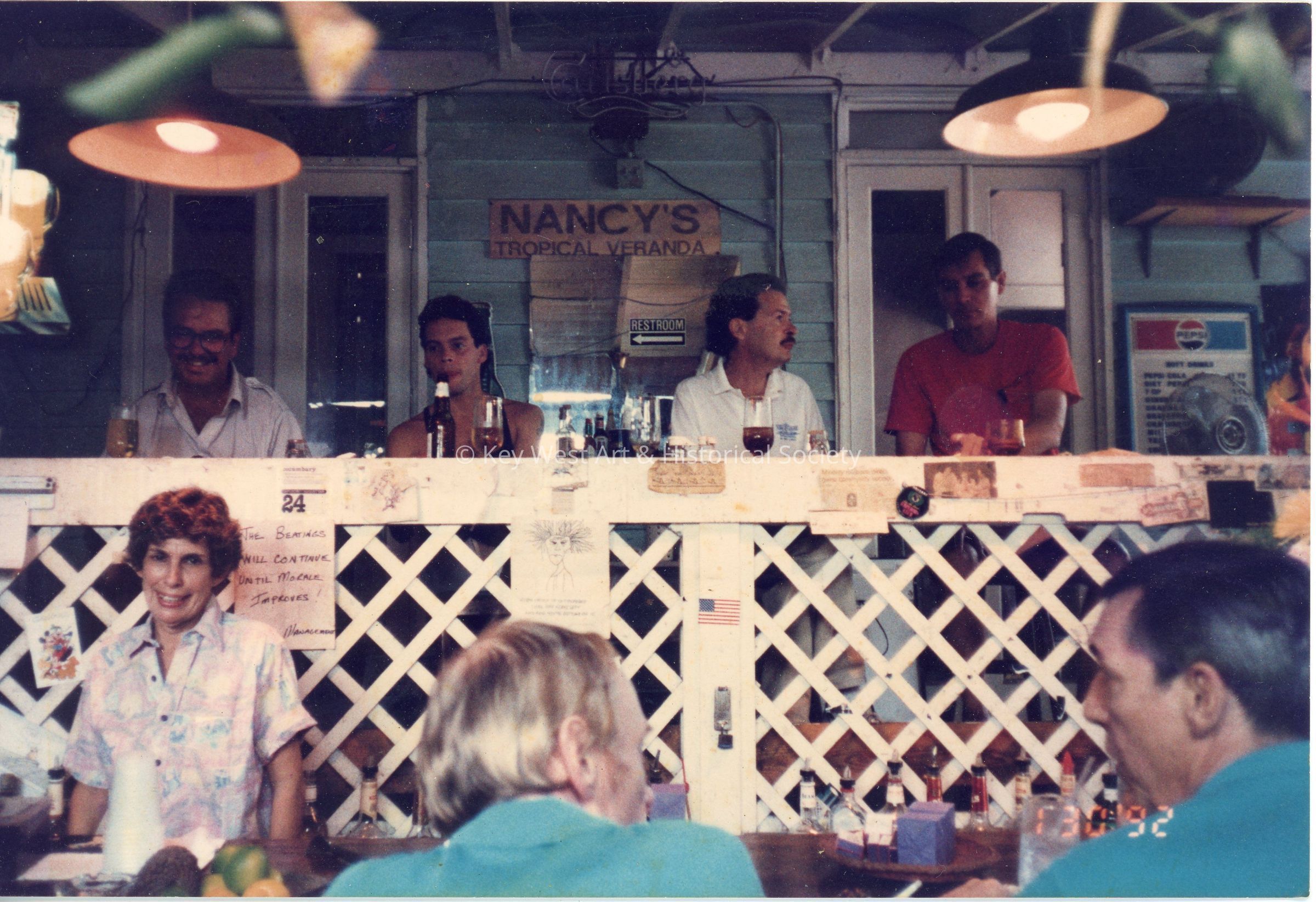 Nancy Loewy behind the bar at the Pigeon House Patio Restaurant and Bar formerly located at 301 Whitehead Street. There is a sign in the background that reads "Nancy's Tropical Veranda" and there are patrons at the bar.