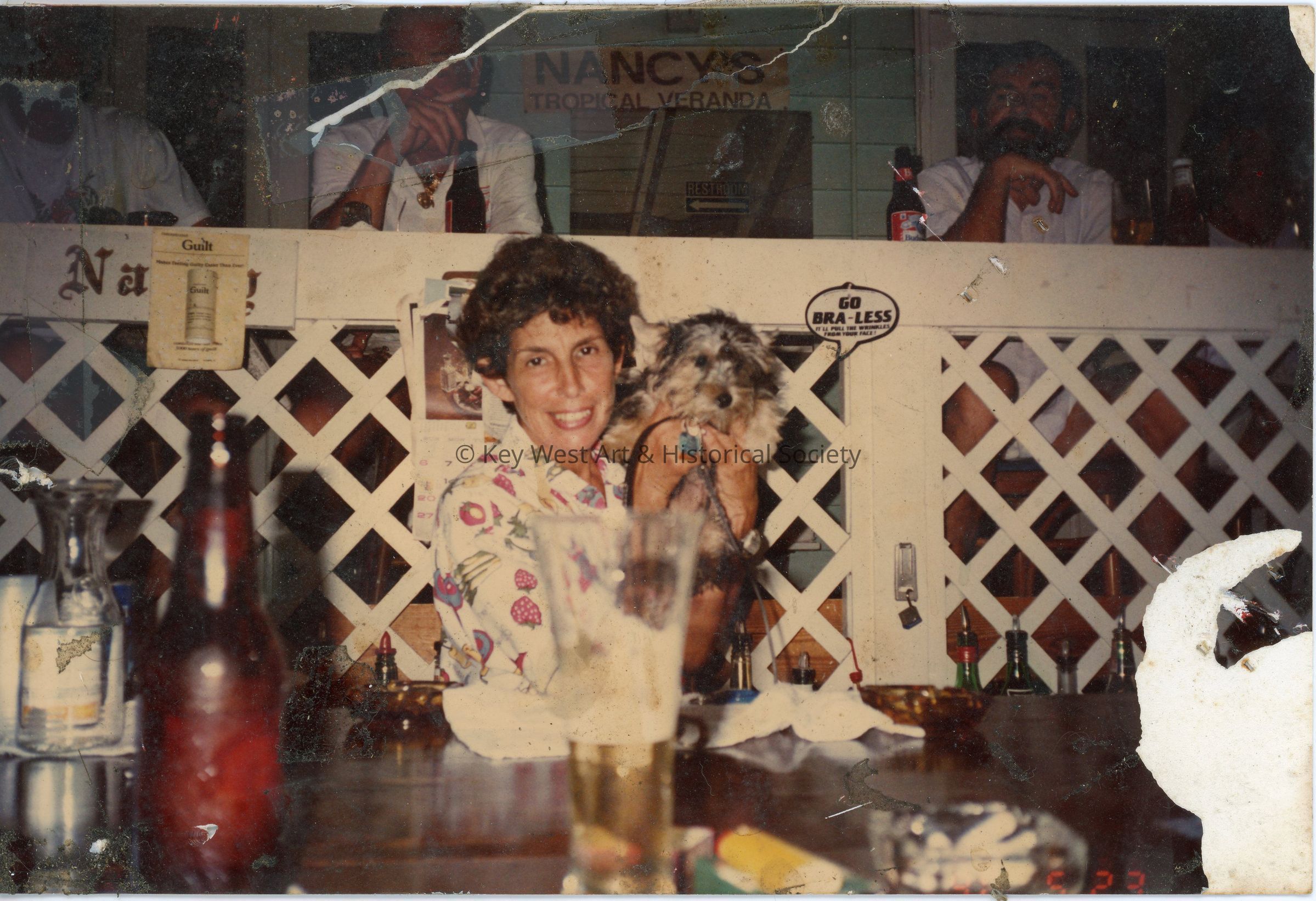 Nancy Loewy holding a small dog behind the bar at Pigeon House Patio Restaurant and Bar formerly located at 301 Whitehead Street. There are several patrons on the raised portion of the veranda behind the bar.