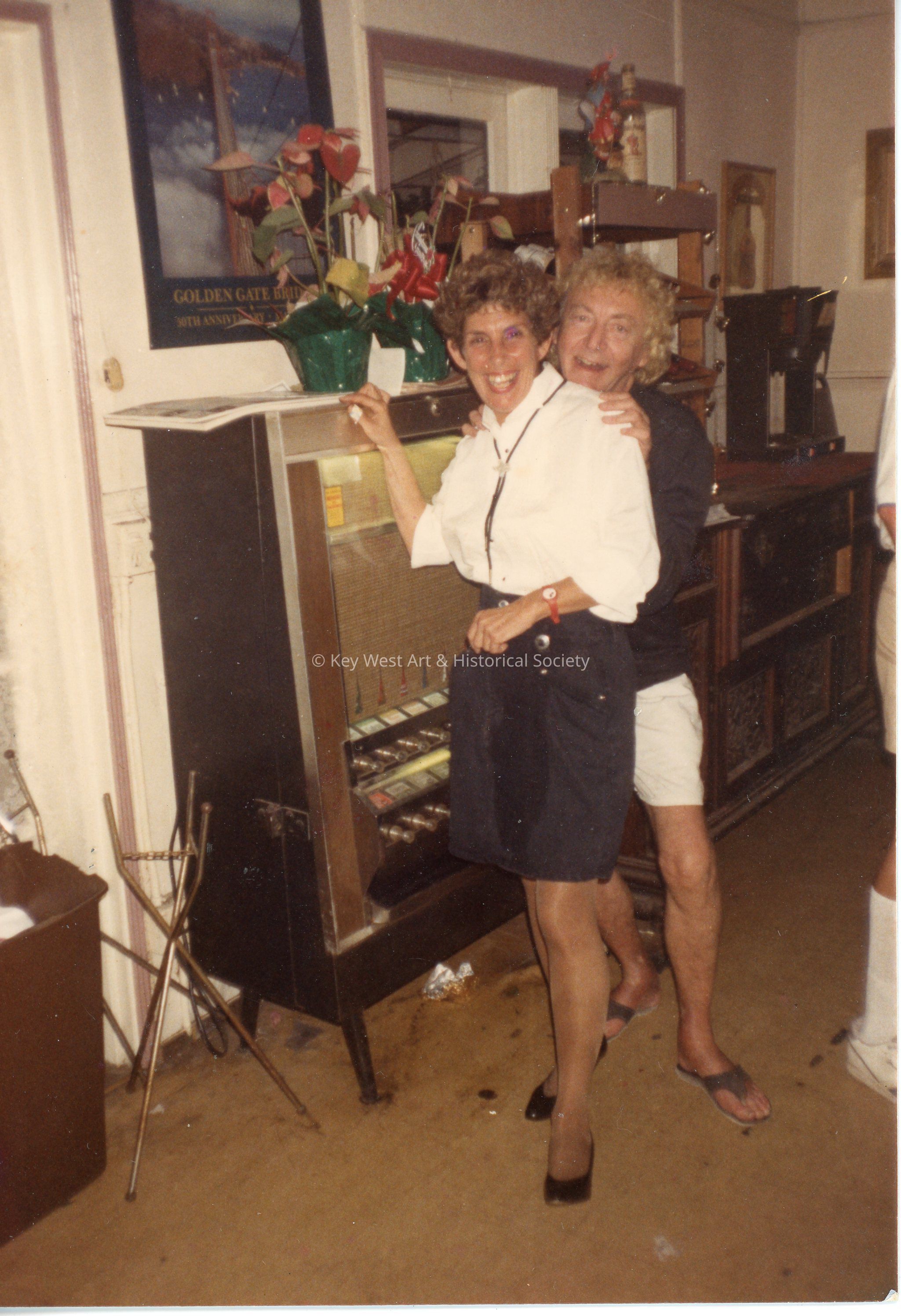 Photograph of the lobby of the Southern Cross Hotel with the owner Guy Saunderson and Nancy Loewy. The hotel was formerly located at 326 Duval Street.