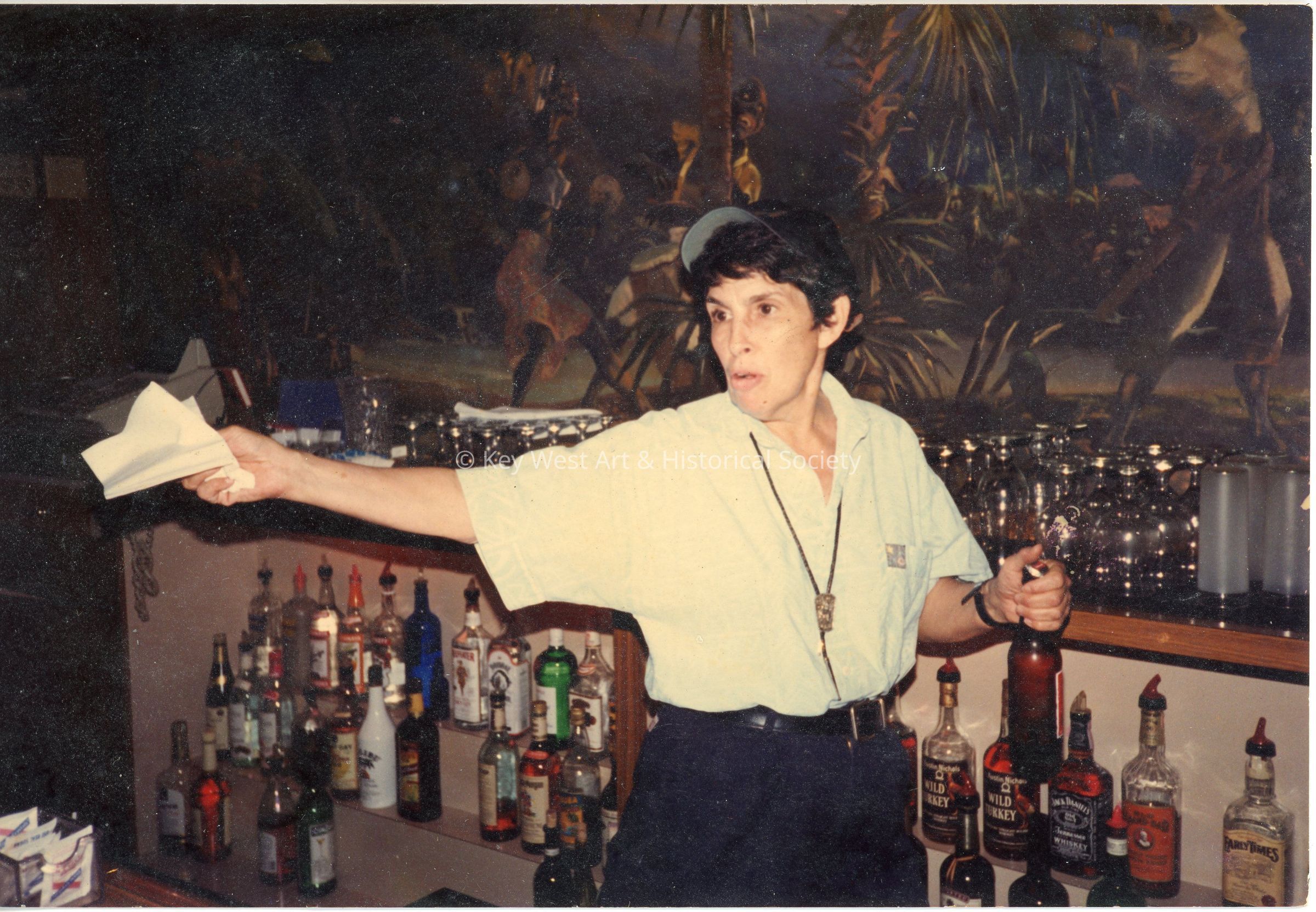 Nancy Loewy at the bar in the West Indies Lounge of the Santa Maria Motel located at 1401 Simonton Street. A large mural is behind her.