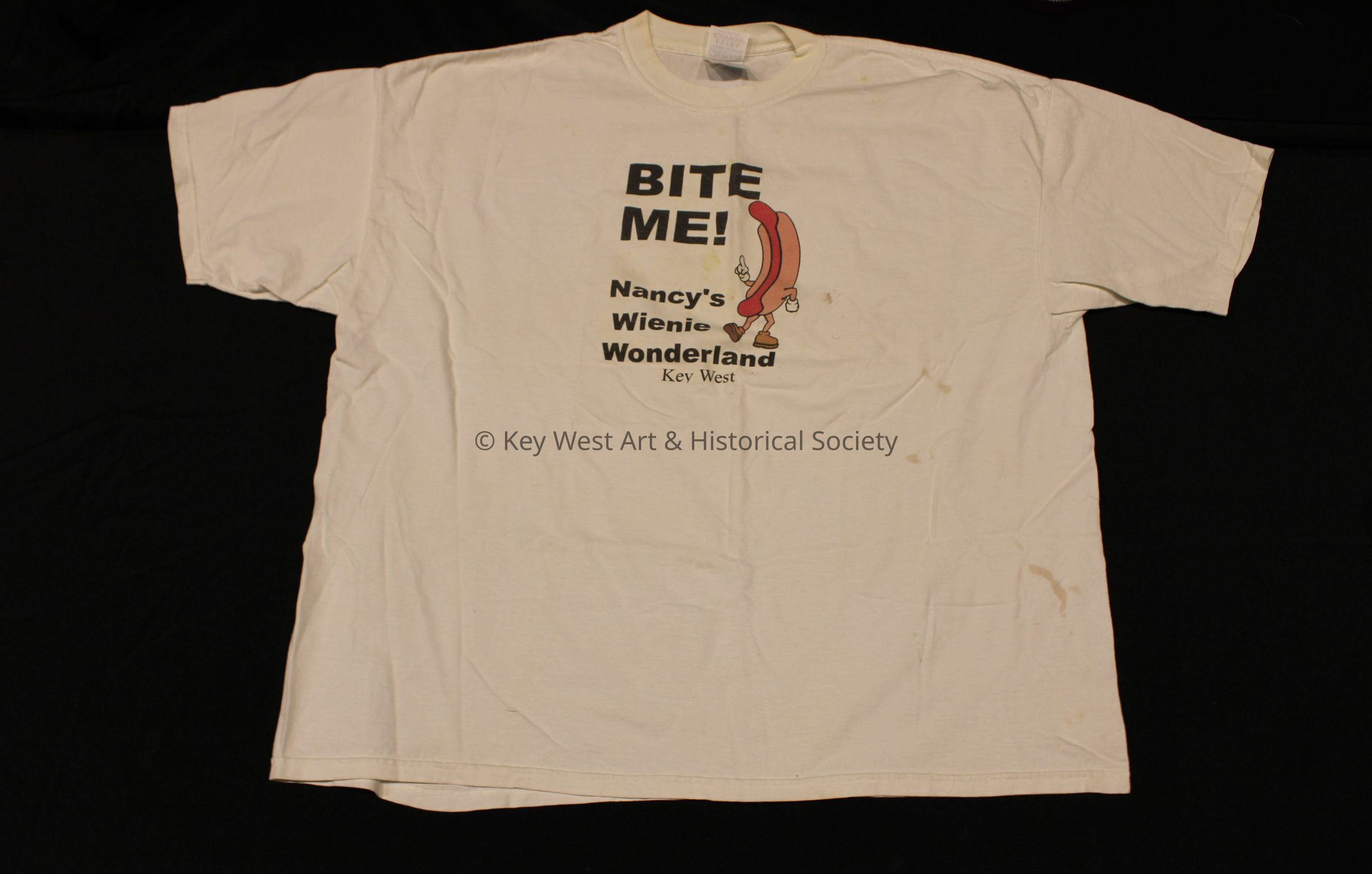 Cotton short sleeved shirt with "Bite Me! / Nancy's Wienie Wonderland Key West" in black lettering with a hot dog in a bun to the right.