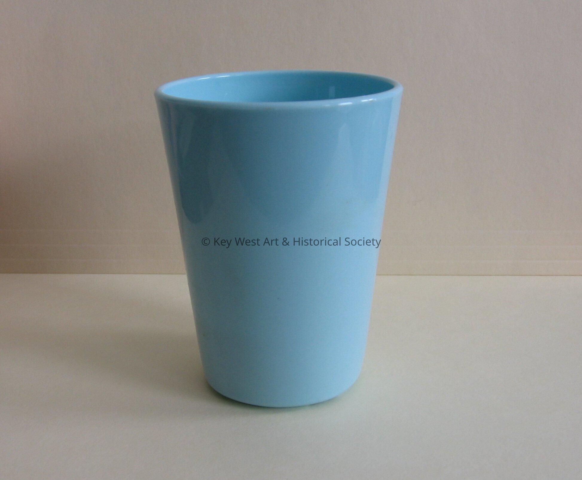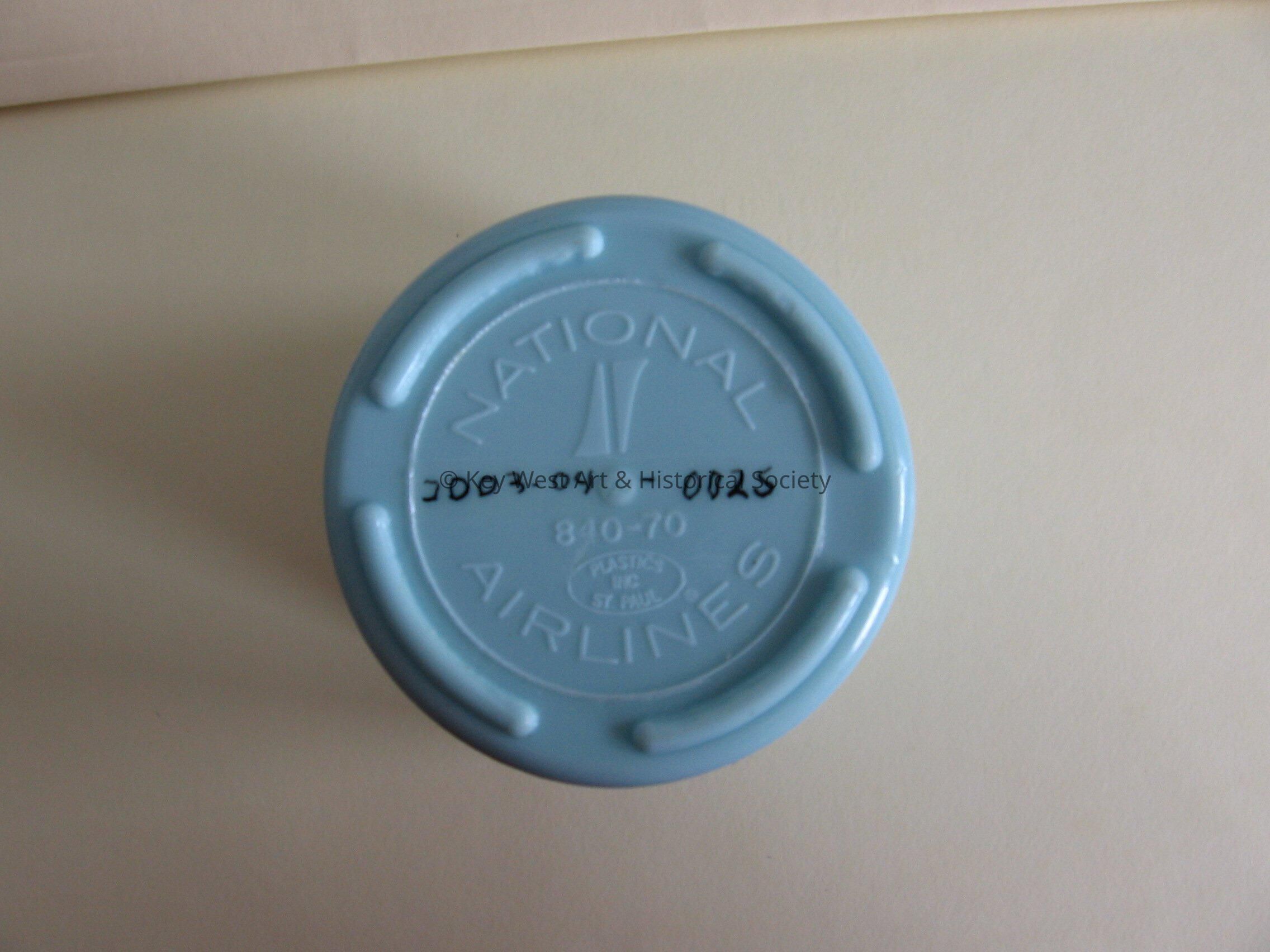 Blue plastic drinking cup used by National Airlines. Airline name printed on the bottom.