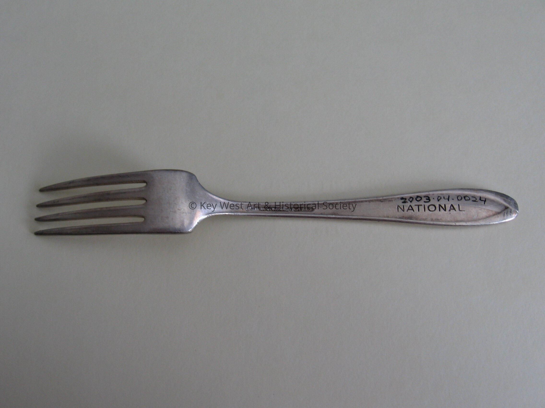 National Airlines silver salad fork with 'National' engraved on the handle.