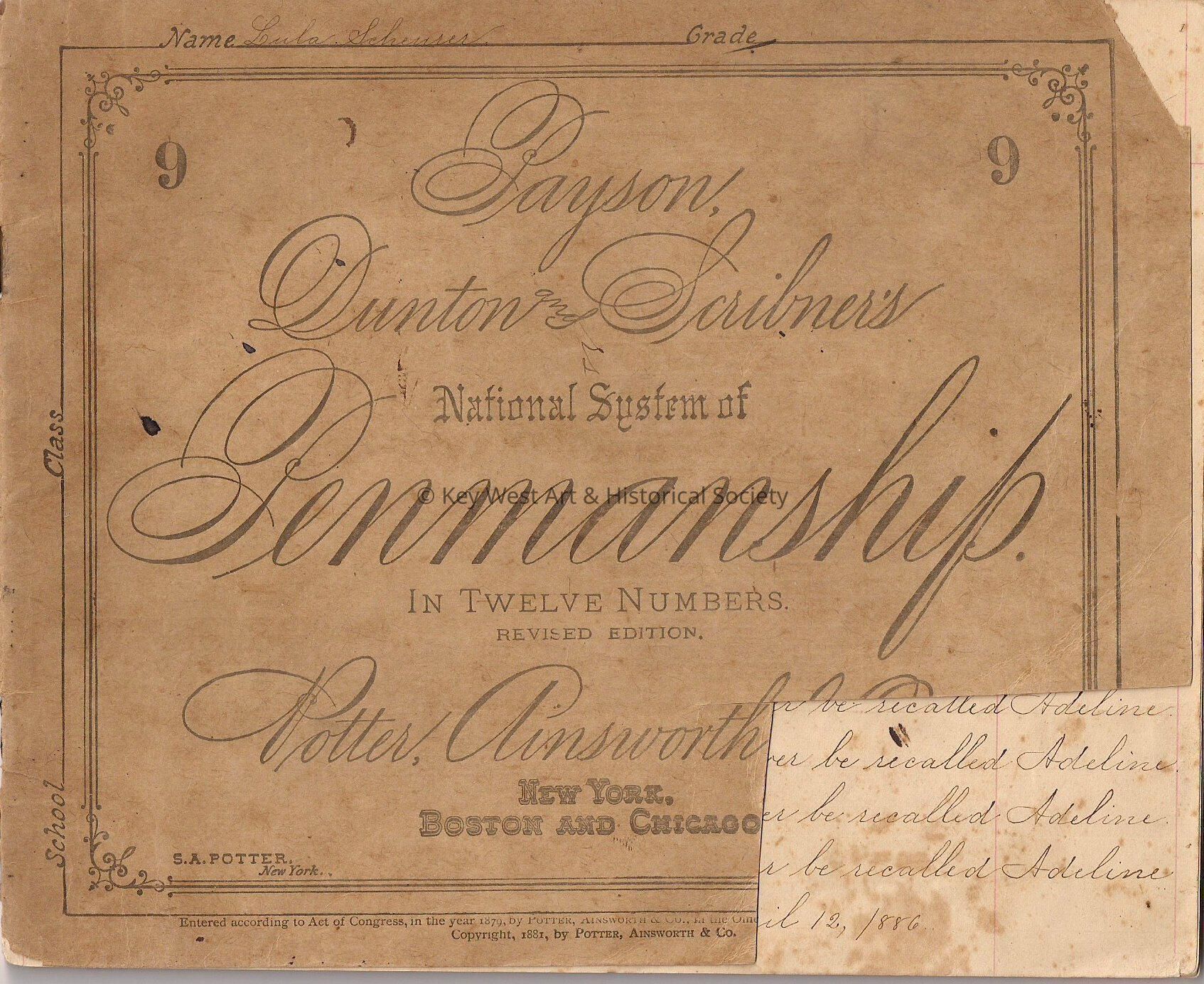 'Payson, Dunton and Scribner's National System of Penmanship. In Twelve Numbers. Revised Edition. Potter, Ainsworth & CO.' penmanship book. Belonged to Linda Scheurer. One sentence is written at the top of the page. The lines below are meant for copying the sentence as penmanship exercises.Collection