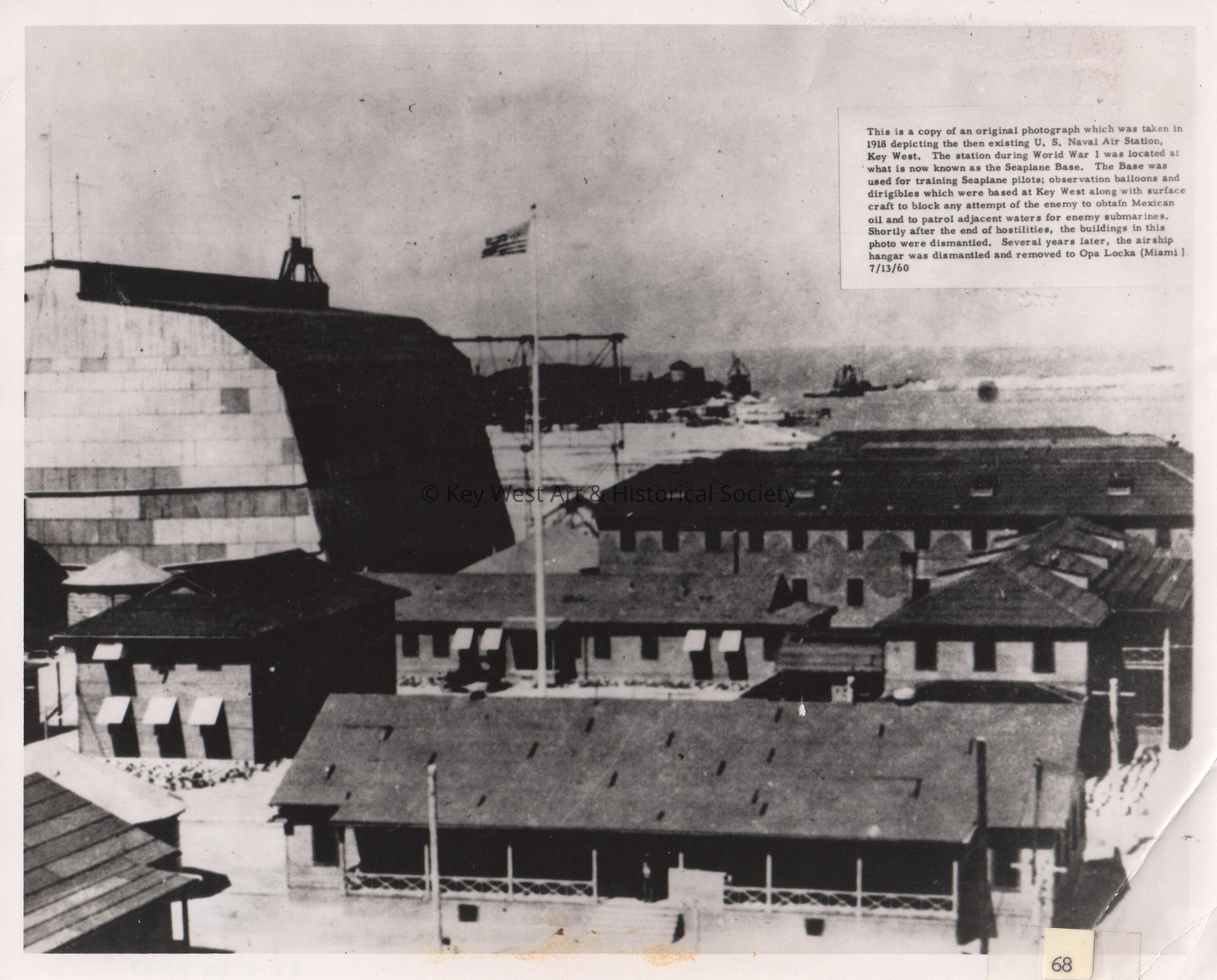 Black and white photograph of Naval Air Station Key West on Trumbo Point. Caption overlaid on the image reads, 'This is a copy of an original photograph which was taken in 1918 depicting the then existing US Naval Air Station, Key West. The station during World War I was located at what is now known as the Seaplane Base. The Base was used for training Seaplane pilots; observation balloons and dirigibles which were based at Key West along with surface craft to block any attempt of the enemy to obtain Mexican oil and to patrol adjacent waters for enemy submarines. Shortly after the end of hostilities, the buildings in this photo were dismantled. Several years later, the airship hangar was dismantled and removed to Opa Locka (Miami).'Photograph Details