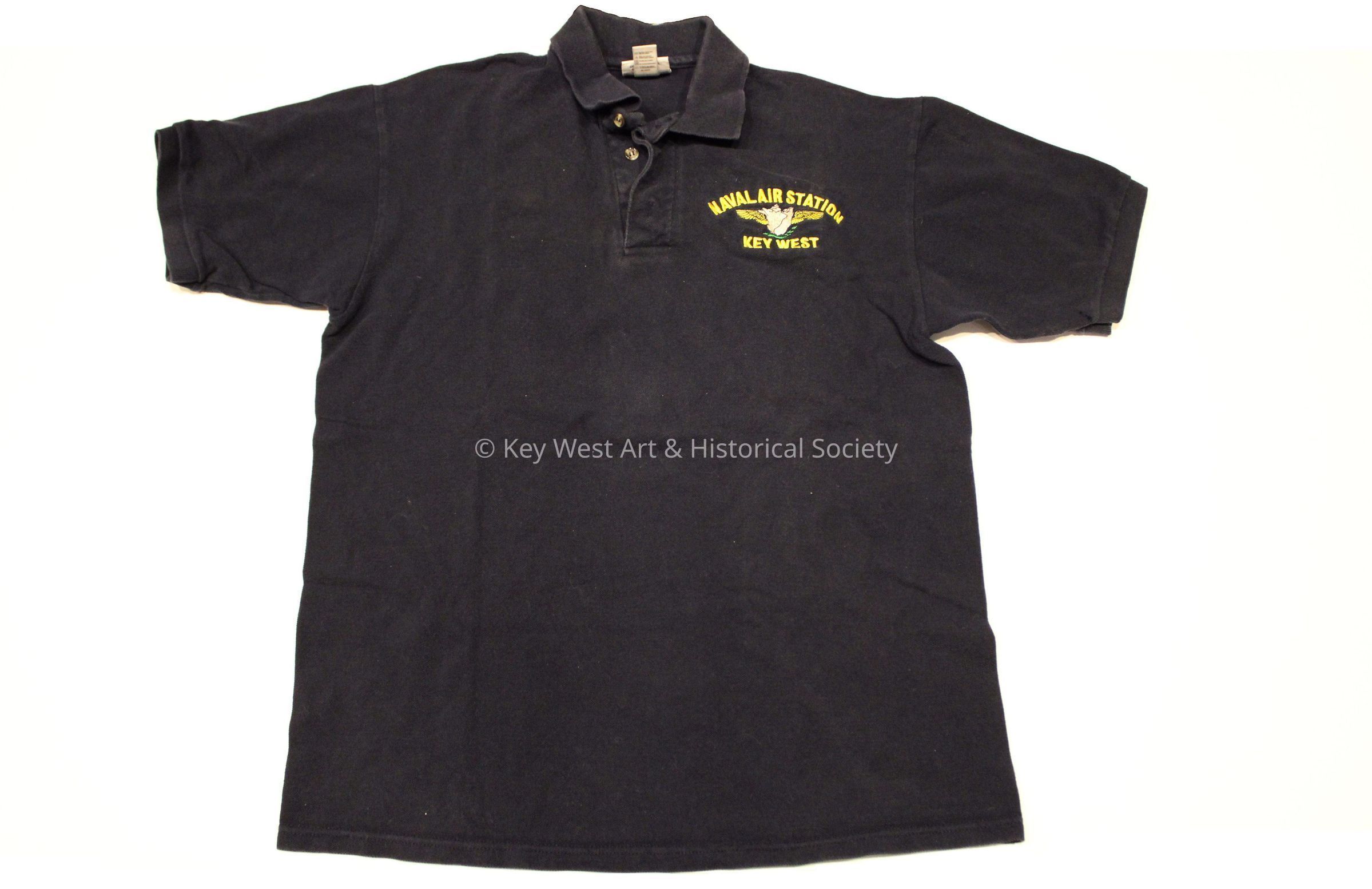 Cotton dark navy blue Naval Air Station (NAS) Key West short sleeved polo shirt with embroidered insignia. Size medium.