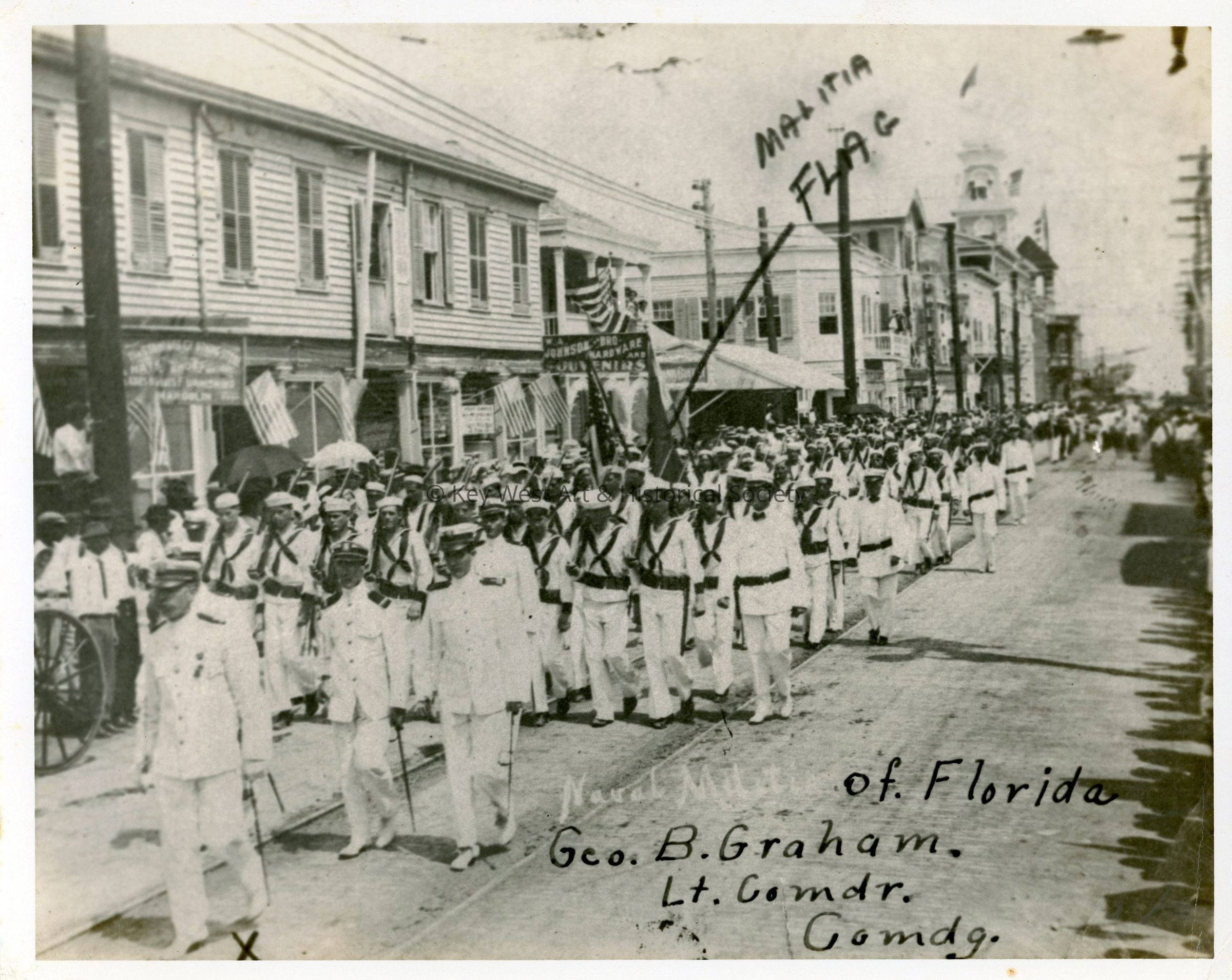 Black and white photograph of the Naval Militia of Florida, LCDR George B. Graham commanding, marching on the 100 block of Duval Street to celebrate the arrival of the First Oversea Railway train.