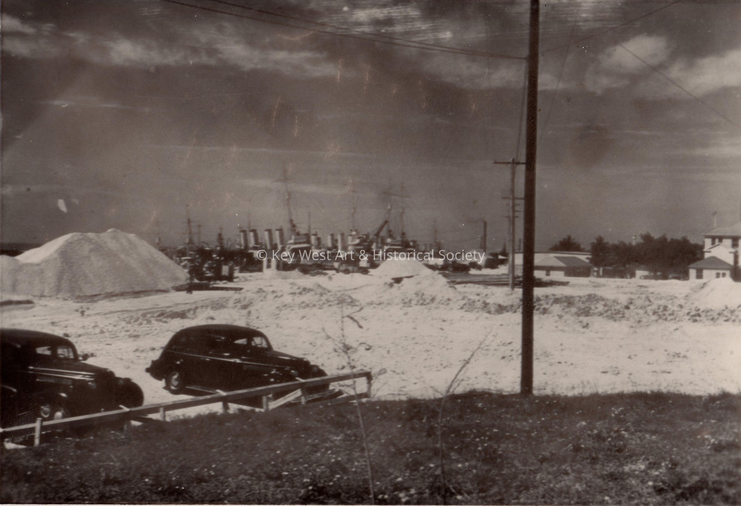 Site of Key West's US Navy power house torpedo and battery overhaul shop, with submarine shop buildings and four-stacker DDs, February 27, 1941.Collection