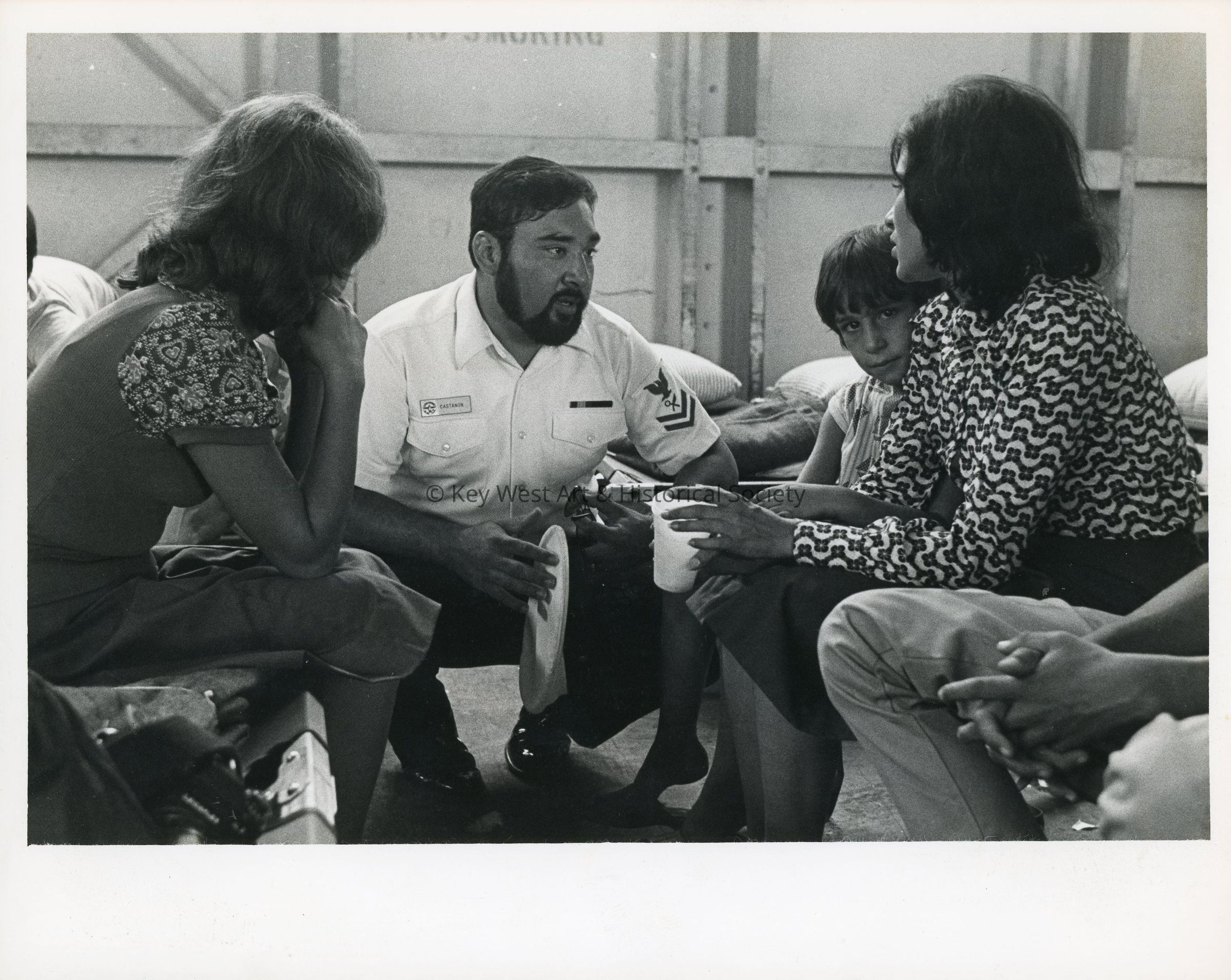 Black and white photograph of US Navy Petty Officer Second Class Salvador Castanon speaking with Cuban Refugees at Trumbo Point Refugee Center. The refugees were housed in the Center, an abandoned Navy aircraft hanger while awaiting an airlift to Eglin Air Force Base.