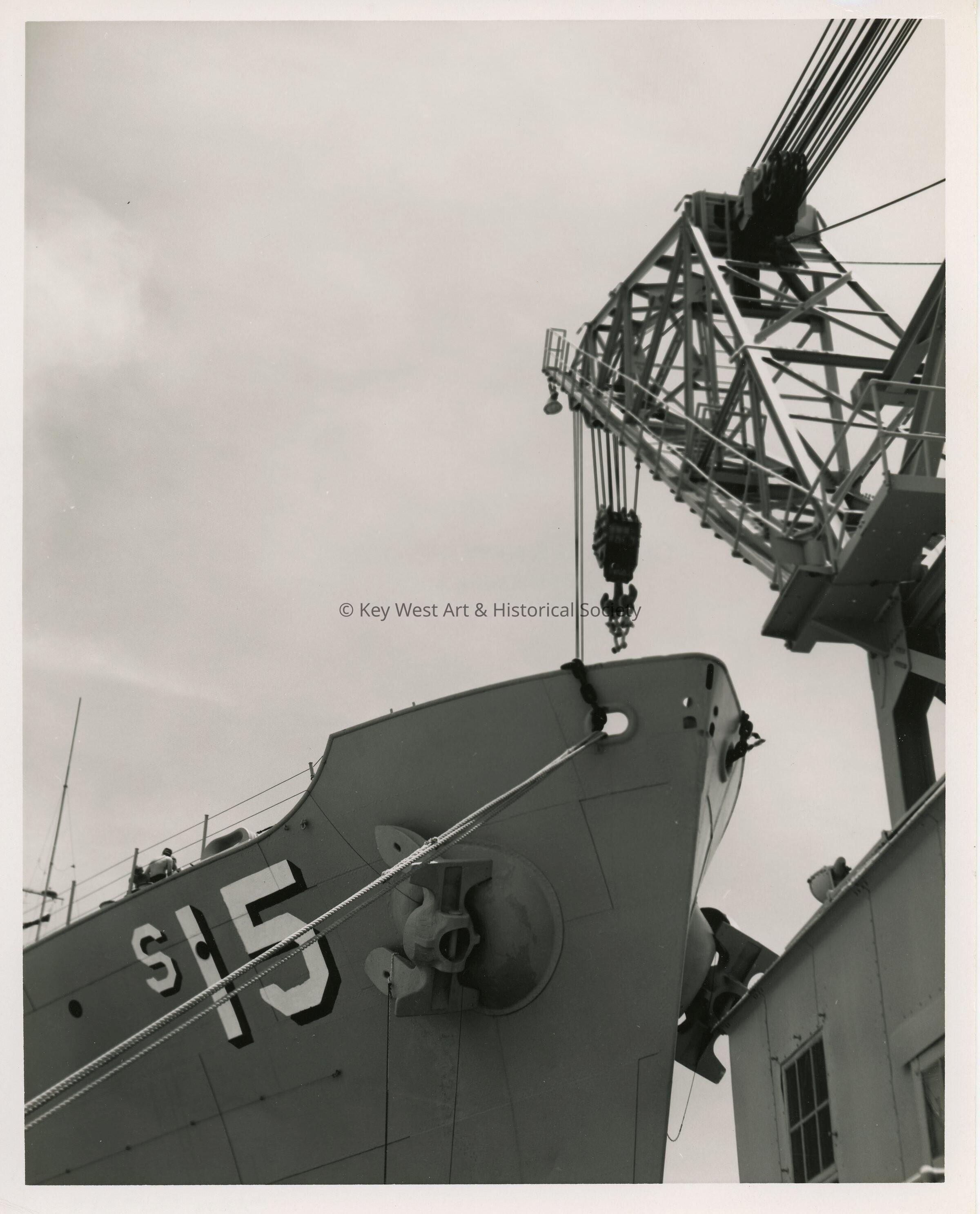 Navy Ship with a crane next to it